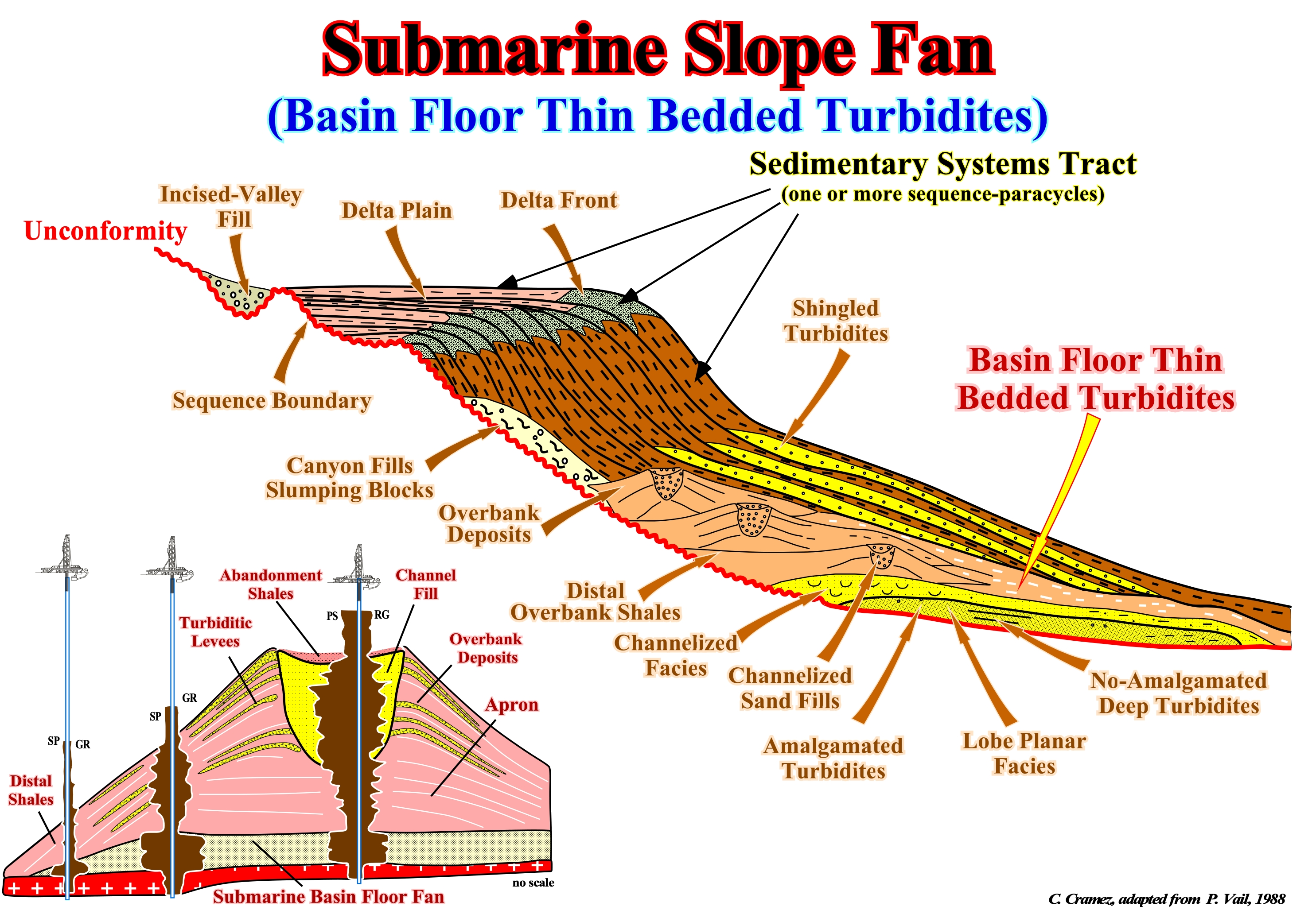 Deltas are formed by the accumulation of allochthonous sediments in the mouths of the fluvial currents, both in the lakes and in the sea, promoting, in the latter case, the progradation (seaward displacement) of the shoreline. Sedimentary accumulation occurs both above and below sea level, when it is faster than sediment removal by coastal sediment transport processes. In this figure, the bifurcation point of the Zambeze River delta (Mozambique) is easily recognized, both in satellite photography and in the delta sketch, in which are mapped: (i) Upper Delta Plain ; (ii) Lower Delta Plain and (iii) A portion of the abandoned delta. A delta is a sedimentary systems tract, i.e., a lateral association of different synchronous and genetically bound depositional systems*, which can be deposited, within a sequence-cycle, either under lowstand geological conditions, in a lowstand prograding wedge (LPW) or in highstand geological conditions, usually in the highstand prograding wedge (HPW) but, sometimes, also in the transgressive interval (TI). In general, a delta is formed by a lateral association of contemporary depositional systems, which characterize: 1) The upper sub-horizontal delta layers (upper beds, topset beds) ; 2) The inclined seaward delta layers (inclined beds, foreset beds) and 3) The lower sub-horizontal delta layers (lower beds, bottomset beds). The former are formed by sands, siltstones and shales of the deltaic plain, which, as in the case of the Zambeze delta, can be deposited either on the upper (more fluvial) delta or on the lower (more estuarine) delta and the delta front sands. The delta front is a site of intense deposition where the delta morphology is, actually, established and where the coarsest sediments are deposited in bars in front of the distributive channels, whose morphology depends on: (a) Flow energy and (b) Density difference between river water and water. The delta layers inclined seaward are formed by pro-delta shales, which are located below the action level (erosion) of the waves and where fine sedimentation predominates (silts and clays). In the lower sub-horizontal delta layers, which sometimes deposit at the base of the pro-delta, it is possible to recognize turbidite depositional systems of sandy facies (proximal turbidites of the Shell's geoscientists) associated with delta front failures and landslides. The facies of the delta plain are, mainly, silty, while the delta front is, generally, sandy and that of the pro-delta clayey. The chronostratigraphic lines of the delta plain and delta front, i.e., the depositional surfaces, are practically horizontal (upper beds), while those of the pro-delta are inclined to the seaward (foreset beds). In the distal part of the pro-delta, sub-horizontal intervals known as sub-horizontal lower layers may be deposited in continuity, which have, generally, a clayey facies. However, sometimes in the lower layers, that is, in the most distal and lowest part of the pro-delta, are small sand lobes of turbidite origin, which, as stated above, certain geoscientists have called proximal turbidites. As a delta progrades, the angle of the delta slope, i.e., more or less, the slope of the pro-delta increases and can reach a critical angle (which varies with the water-depth), from which all the delta front progradation is impossible. If the critical angle is reached, the delta front collapses and creates small turbidite currents transporting the sedimentary particles downward to the distal and deep part of the pro-delta. When the currents decelerate, at the base of the delta slope, the sedimentary particles that they transport deposit themselves forming small lobes or turbidite fan. Aggradation allows progradation, once in the field or on seismic lines, in continuity of sedimentation, over an aggradational interval there is, almost always, a progradational interval which has been deposited upstream of a deep aggradational interval and downstream of a shallow water aggradational interval (Johannes Walther's facies rule or simply Walther's law, which Armanz Gressly had already fully understood).
