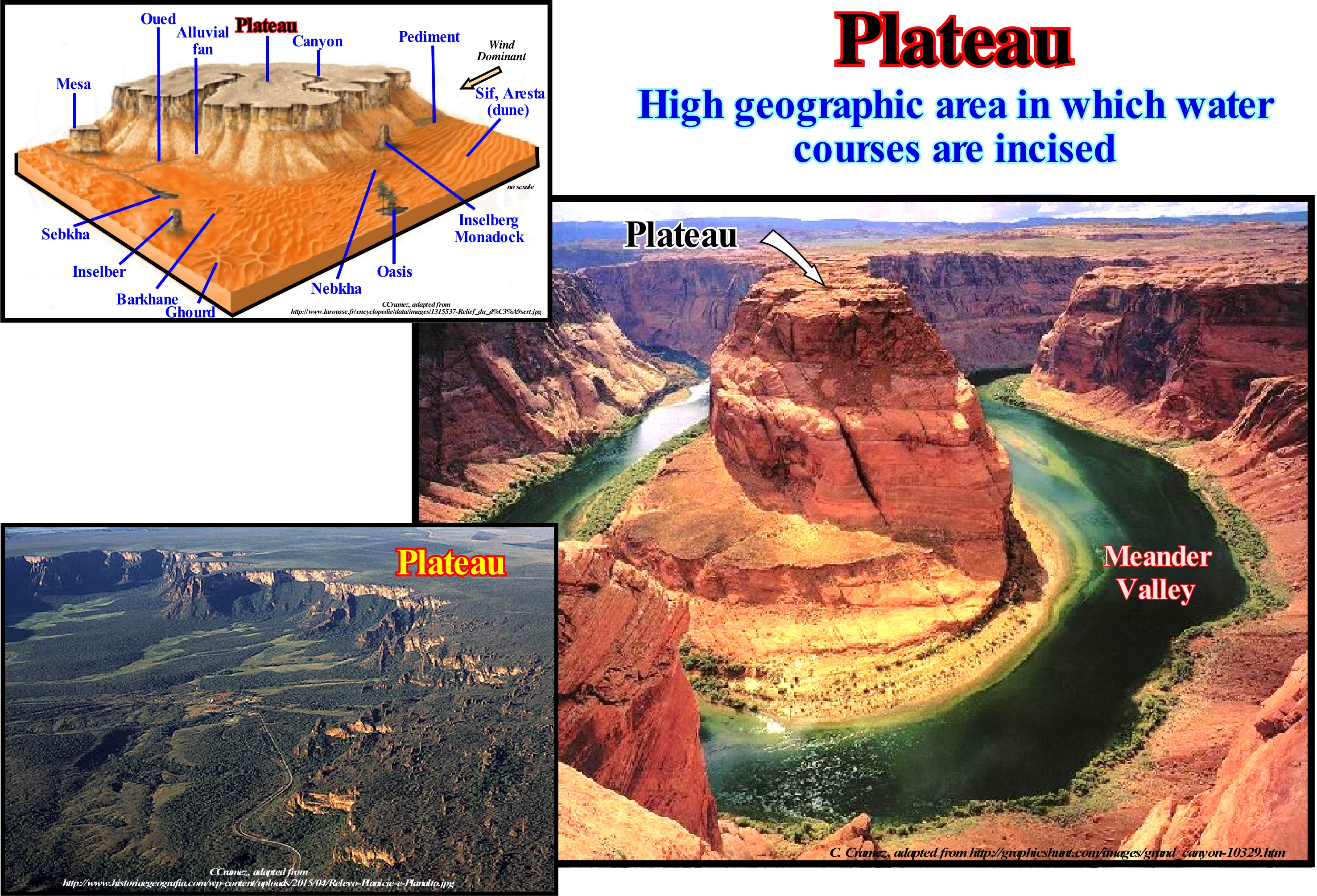 In geology, a plateau is a flat, high, large terrain (not to be confused with a mesa) or a great plain on hills. When a plateau is very eroded like, which is illustrated in this photograph (Colorado Plateau, USA), it is sometimes called dissected plateau. When a plateau is created by volcanic activity it is spoken of a volcanic plateau. Some geoscientists consider that a plateau must be at least 500 meters higher than the terrain around it and that one of its sides must be very steep. The surface of a plateau is very variable. There are plateaus the size of a city, but there are also others that have several times the surface of country. The highest and highest plateau in the world is the plateau of Tibet, which is perhaps best known by the name "Ceiling of the World". The Tibet plateau, which resulted from the collision between the Indo-Australian and Eurasian lithospheric plates, is still rising today. Some plateaus result from a rapid geological survey (in geological terms), others are associated with slow vertical movements of large stable geological units. Still others, like the roof of the world, that are located, generally, between the mountains, result from the collision of lithospheric plates. About 45% of the Earth's total surface is formed of plateaus. In Australia, two-thirds of the land surface is occupied by the Western Plateau, which has, probably, existed for more than 500 Ma (Paleozoic). About 25% of China's surface is made up of plateaus. The plateaus, like all high lands, are y carved, continually, by erosion. When the plateaus have rivers they are cut by canyons, which dig them, as they try to reach the base level of the lakes or the ocean to which they flow. The formation of such canyons with valley meanders (not to be confused with meanders of alluvial plain), as illustrated in this photograph, can take tens of millions of years. In fact, there are two main types of meanders: (i) Valley Meanders or Incised meanders are those in which the valley of the meander river as the river, on the same scale, which means that the meanders are more or less permanent ; (ii) Alluvial Plain Meanders of, which certain French geoscientists call, erroneously, free meanders or wandering meanders, are those in which the sinuosities of the river are independent of the layout of the valley and have very different scales, i.e., the valley is very larger than the river and that the meanders, which are not permanent. The tendency for lowland rivers to form meanders is a form of energy dissipation in periods when flow rates (*) (flow rate = precipitation - infiltration - evapo-transpiration) are higher. As an example of the former we can mention the meanders of the Douro or Mondego rivers (between Penacova and Coimbra, where the river runs through a narrow valley). Examples of the others are the meanders of the Mississippi River (the United States) or Amazonas (Brazil). The term plateau is used, also, by many geoscientists to designate certain underwater topographies, whether associated with continental crust, such as the Seychelles plateau, or volcanic spills such as the Ontong Java Plateau in SE Asia. With respect to the surrounding terrain, the "tepuis" of Venezuela, Brazil and Guyana are the highest plateaus, with vertical walls of more than one kilometre of altitude. The term "tepui", which in the native language of Pemon (indigenous peoples who inhabit the Great Savannah) means "house of the gods", designates the horizontal top or table of the highlands of Guyana (South America), especially, in Venezuela and eastern Guyana. The "Tepuis" are more like isolated entities than connected, which favours the development of endemic species of plants and animals. Among the most well-known "tepuis" we can mention are Neblina, Autana, Auyantepui and Monte Roraima, which are, normally, composed of blocks of pre-Cambrian quartzite sandstone that rise abruptly from the jungle, giving rise to spectacular natural landscapes. The "tepui" of Auyantepui is the source of the "Falls of the Angel" (State of Bolivia, Venezuela), which are the The highest water-falls in the world, with a height of 979 meters and a dive of 807 meters. The 979 meters high include about 400 meters of inclined and fast water-falls under the main jump and a diving or about 30 meters downstream from the rapids (https://en.wikipedia.org/wiki/ Angel_Falls).