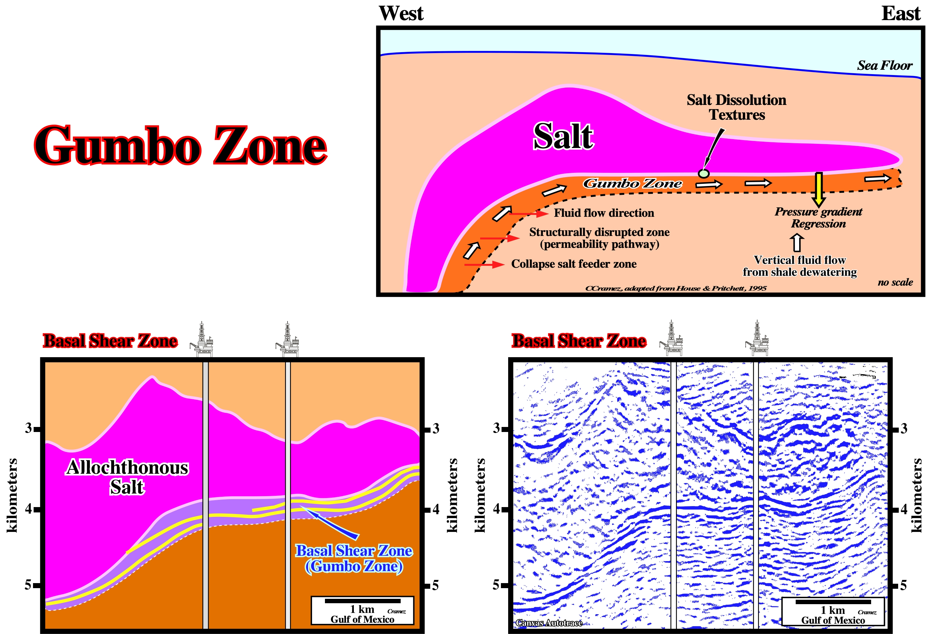 The Gumbo zone was discovered when oil companies tested the hydrocarbon potential of subsalt prospects. They found major drilling problems at the bottom of the salt layer due to the over-pressures of the Gumbo zone. On the other hand, seismic interpreters soon realize the seismic marker associated with the bottom of the salt, was, actually, induced by the Gumbo zone rather than by the salt. So, when an obvious bottom of allochthonous salt is recognized on a seismic line, the chances that a Gumbo zone is present are quite high.