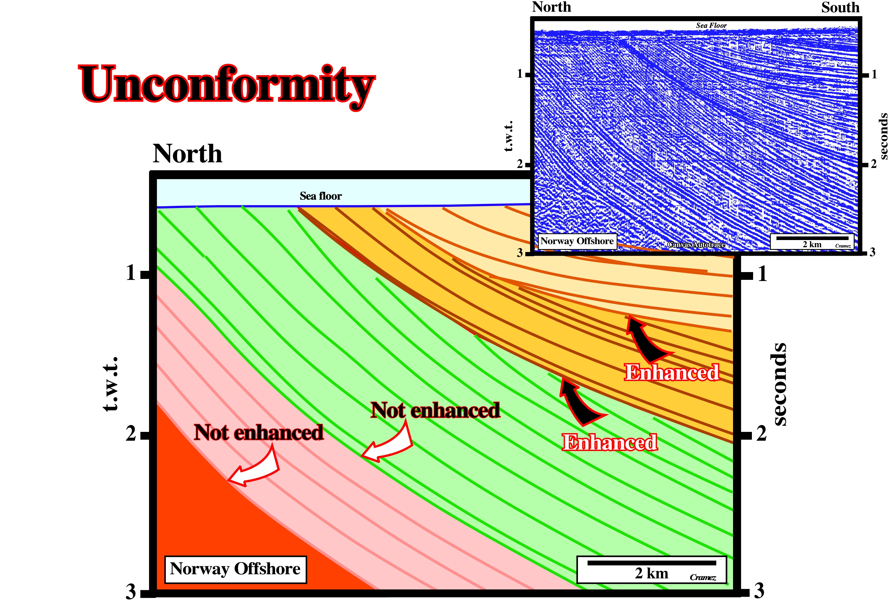 On this tentative geological interpretation of a Canvas autotrace of Norway offshore seismic line, several unconformities can be, easily, recognized by onlap and toplap (truncation) geometrical relationships. These unconformities limit stratigraphic cycles associated with 2nd order eustatic cycles.