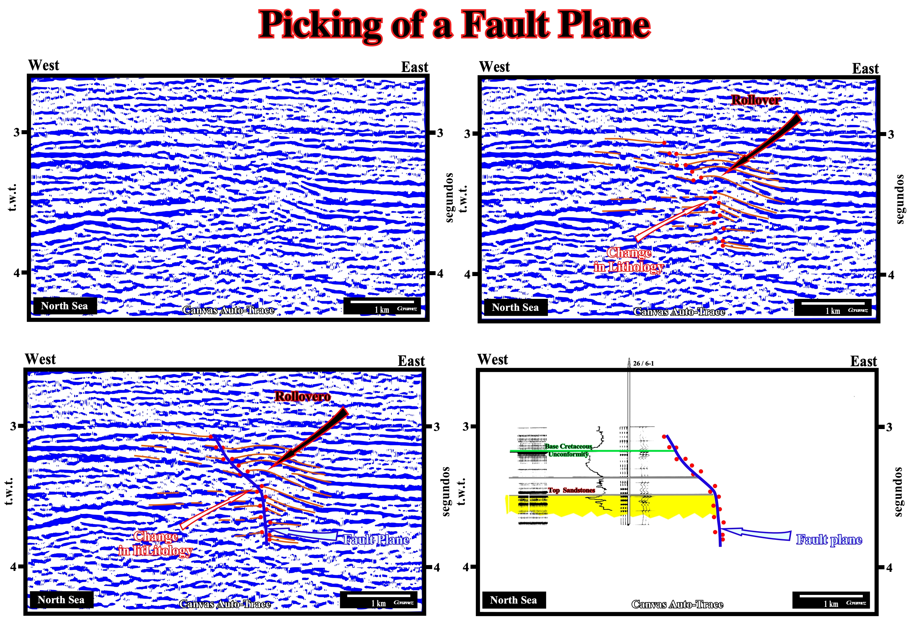 Figure 091- On this figure are illustrated two examples of North Sea. In the first one (top), the terminations of the reflectors of the faulted blocks (see, below, the detailed picking of the fault plane) show, clearly, the dip variations of the fault plane and a rollover (accommodation fold) in the reflectors of the hangingwall, suggesting a lateral change in lithology between the faulted blocks. In the example at the bottom, which is calibrated by the results of an exploration well, the fault plane following the reflectors terminations (red dots) shows, also, a change in the dip of the fault plane and a rollover in the hangingwall (which descends relative to the footwall). The calibration of seismic line of this Canvas auto-trace shows, in relation to the footwall, that the fault plane is more upright when it crosses sands than when it crosses shales (see later).
