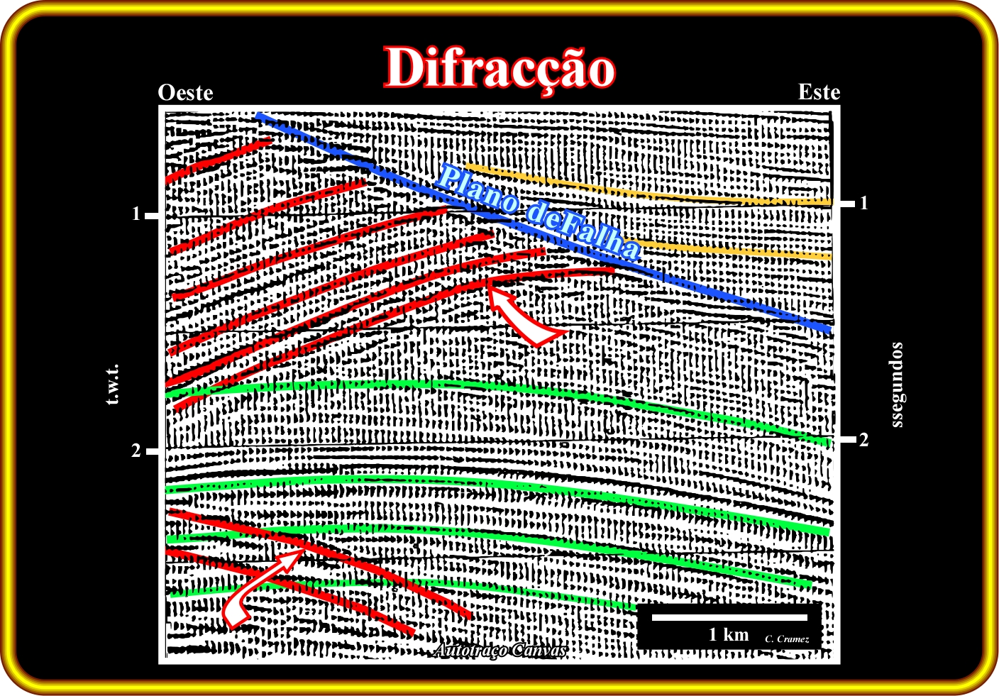 A analogia entre a teoria dos raios sísmicos e a óptica generaliza o conceito de difracção, que se pode definir como a transmissão de energia por um raio de trajecto não-geométrico. Nos dados sísmicos, as difracções ocorrem, quando o raio de curvatura da superfície reflectora é menor, que alguns comprimentos de onda da onda incidente. A teoria das zonas de Fresnel diz, que as ondas se reflectem de uma área, mais ou menos, grande (zona de Fresnel) e não a partir de um simples ponto. Segundo esta teoria, um raio que atinja a extremidade de um reflector, não obstante a geometria da sua trajectória (rectilínea), um observador não o pode ver (o que reflecte é uma área e não um ponto), uma vez que a energia é difractada à volta da extremidade do reflector. A primeira zona de Fresnel pode ser vista como a de um cone, que tem como ápice na extremidade do reflector. As difracções ocorrem nas terminações dos reflectores, como no caso de uma falha. Elas são, em geral, hiperbólicas e atravessam os outros reflectores, o que quer dizer, que elas não têm nenhum valor cronostratigráfico. Neste autotraço (Canvas) de linha sísmica não-migrada, há um grande número de difracções, que sugerem a existência de descontinuidades entre dois blocos falhados. No bloco levantado (esquerda) a amplitude das difracções é maior que a das reflexões. No canto inferior esquerdo, as difracções são, provavelmente, criadas por um ponto localizado fora do plano da perfil sísmico. Contrariamente, a uma ideia muito aceite, as ondas, como, as onda da luminosas não se propagam em linha recta, mas segundo o trajecto, que lhes toma menos tempo. Quando existe uma falha numa linha sísmica, o plano de falha pode ser definido pela linha, que passa pelos ápices das difracções, como ilustrado acima. A forma hiperbólica das difracções é devida a hipótese do método PPC (Ponto de Profundidade Comum), no qual a fonte e o seu traço são deslocados de uma certa distancia para baixo da linha de tiro, afim que as reflexões da mesma camada sejam captadas pelos geofones em posições ligeiramente diferentes e, que uma reflexão é crida pelo ponto médio entre o geofone e a fonte.