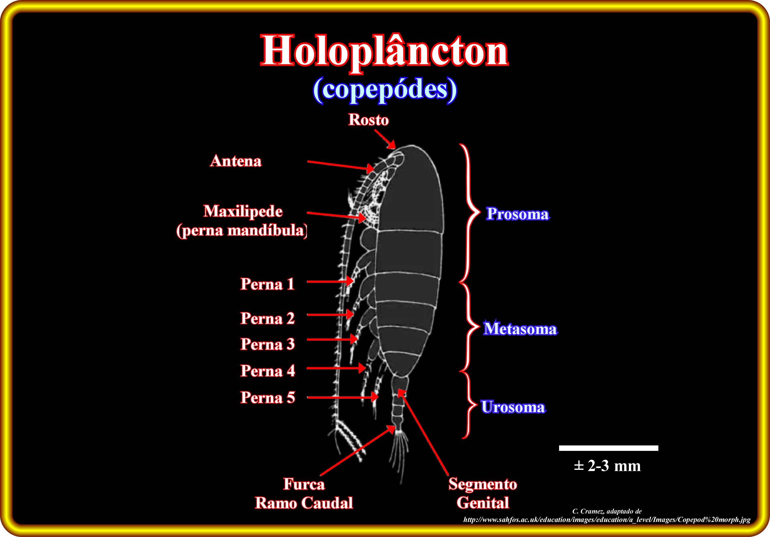 O holoplâncton é uma parte do plâncton animal ou zooplâncton. Chama-se holoplâncton ou plâncton verdadeiro aos corpos que permanecem no estado de plâncton ao longo do seu ciclo de vida. Ele é contrasta com o meroplâncton ou plâncton temporário, que é composto de organismos que passam apenas parte de suas vidas, habitualmente o estado larval, sob a forma de plâncton (medusas, crustáceos, larvas, vermes, etc.). O holoplâncton consiste, principalmente, de microalgas, animais unicelulares e alguns crustáceos como os copépodes, que representam cerca de 70% do zooplâncton. Os copépodos, como ilustrado nesta figura, são organismos planctónicos vivos livres (semelhante a uma pequena cochinilha, variedade de pulgões) que variam entre 1 e 10 milímetros de comprimento. Eles são capazes de circular livremente, sob pequenas distâncias, sacudindo os membros articulados e as antenas. Isto é interpretado como sendo um mecanismo para evitar predadores. As suas antenas ajudam, também, a evitar que eles se afundem através da coluna de água. Existem milhares de espécies de copépodos que formam o holoplâncton. Algumas vivem em água doce, mas a maioria são organismos marinhos, que têm uma morfologia básica. Os copépodos são, provavelmente, os organismos multicelulares mais abundantes na Terra. Certos autores pensam que existem cerca de 11500 espécies de copépodos divididos em aproximadamente 200 famílias e 1650 géneros. Os copépodos são um grupo diverso e, embora alguns sejam carnívoros ou onívoros, a maioria são herbívoros alimentando-se de fitoplâncton. Eles alimentam-se por meio de um sistema de filtragem ou utilizando os apêndices para manipular a célula. A emergência de populações de copépodos durante todo o ano afecta os ciclos de fitoplâncton no oceano. No holoplâncton entram-se, igualmente, cnidários (animais aquáticos conhecidos como celenterados, como as hidras de água doce, medusas, alforrecas, corais, anémonas-do-mar e as caravelas), quetognatas (pequenos animais marinhos com cerca de 15 cm de comprimento, de corpo alongado e não segmentado, com barbatanas laterais e caudais que são extensões da ectoderme), ostracodos (pequenos crustáceos dotados de uma carapaça calcária, composta por duas valvas que se articulam-se através de uma estrutura denominada charneira, localizada na região dorsal do animal), etc.