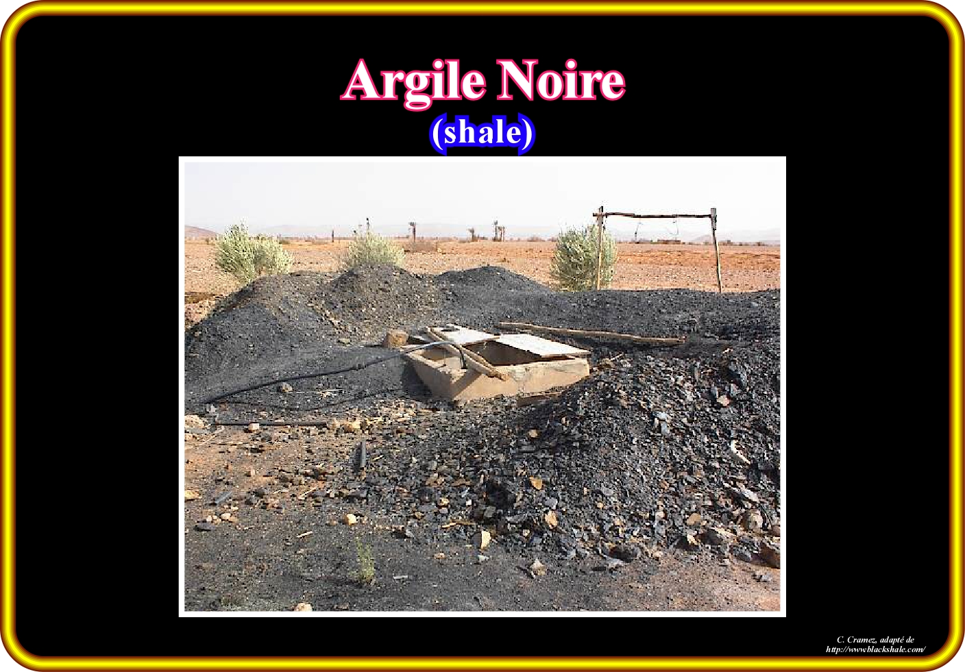 Certains géoscientistes appellent les argiles noires biopélites. Dans les argiles noires, les fossiles (principalement formes planctoniques et nectoniques) sont, généralement, conservés sous la forme de films carbonatées, graphite ou même par pyrite de substitution. Les argiles noires sont très communs dans les strates du Mésozoïque et Paléozoïque, et elles sont très bonnes roches mères de pétrole, une fois enterrées suffisamment pour que leur matière organique atteigne la fenêtre à huile. Ainsi, en Afrique du Nord et Arabie, les "hot shales" du Silurien sont des argiles noirs, et, certainement, les principaux responsables du pétrole, comme en Libye, et en particulier dans le bassin de Murzuq. Ces argiles noires siluriennes se sont déposés d'une manière très particulière. Elles fossilisent la topographie glaciaire créée par l'importante glaciation survenue durant l'Ordovicien. Cette topographie correspond à une série de vallées glaciaires, plus ou moins importantes, orientées Nord-Sud. Quand le niveau relatif de la mer a commencé à monter au cours de la déglaciation du Silurien Initial (transgression silurienne), la mer a envahie, du nord vers le sud, les vallées glaciaires de l'Ordovicien créant environnements anoxiques et réducteurs très favorables à la création et la préservation de matière organique. C'est durant cette phase initiale de la transgression, qui se sont déposées les argiles noires ou "hot shales", comme elles sont connues dans la région et qui forment la base de la formation Tanezzuft (Llandoverien, entre 428-438 Ma). Ces argiles noires sont illustrées dans cette photo. Toutefois, les argiles noires, qui constituent la principale roche mère dans le bassin de Murzuq, ne se sont pas déposées dans tout le bassin, mais uniquement dans la partie inférieure du remplissage des vallées glaciaires de l'Ordovicien. Elles sont couvertes par les sédiments transgressifs, qui couvrent l'ensemble du bassin, et qui passent progressivement aux siltites et sables régressives du Silurien Moyen à Tardif (formation Akakus).
