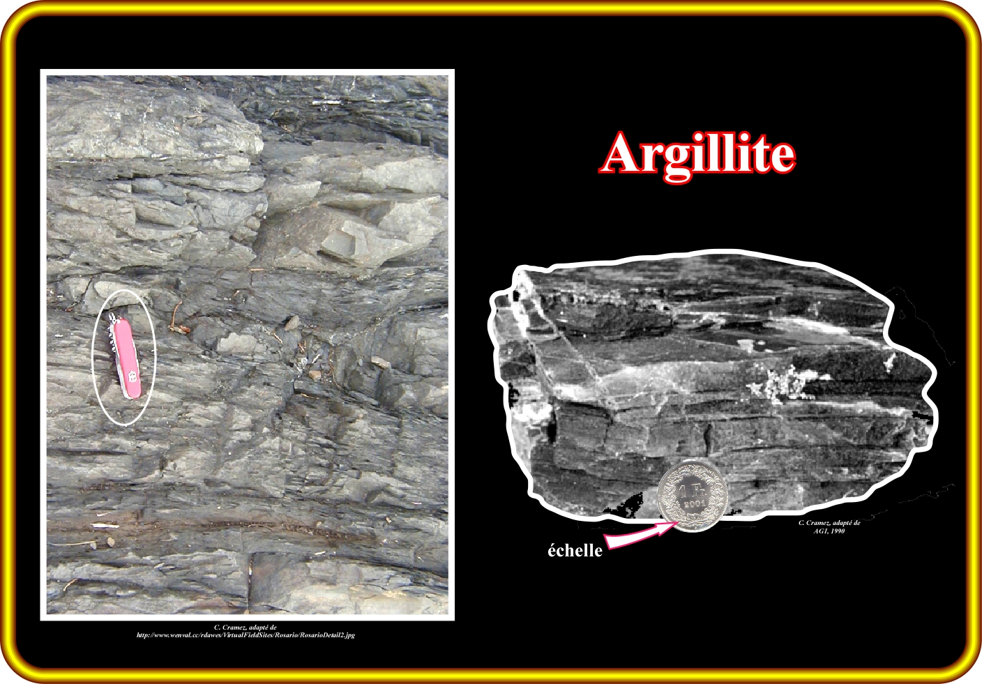 Roche légèrement métamorphisée (recristallisation de l'illite) composée de sédiments argileux et caractérisée par une fracturation irrégulière et une absence de foliation. Un argillite ne correspond pas du tout à une argile ou a une ardoise (shale), comme certains géoscientistes le pensent.