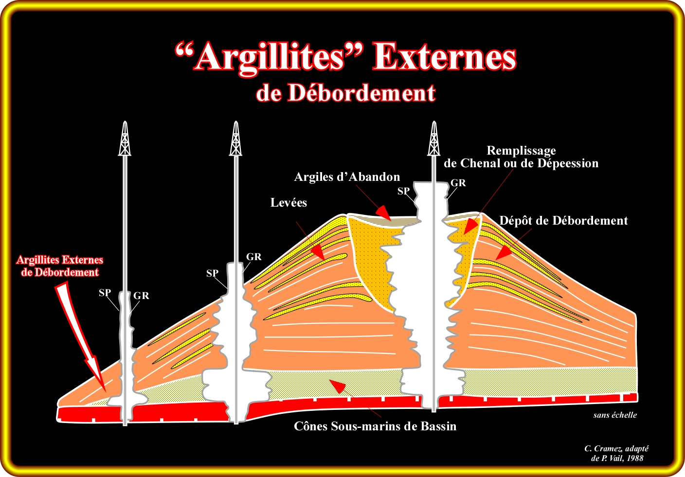 Le terme argillite, ici utilisé de manière abusivement, désigne une roche sédimentaire composée d'argile et boue, plus ou moins, laminaire et non-anchimétamorphique. Par conséquent, on doit dire argile et non argillite externe de débordement. Comme illustré dans ce schéma, dans la plupart des cas, les argiles externes de débordement, ainsi que les digues naturelles, ne sont pas contemporains, mais plus âgés, que les sédiments que remplissent la dépression (ou le canal, quand il y a érosion), pour où passaient les courants qu'en débordant les ont déposés. Le faciès (lithologie) des digues naturelles est, essentiellement, argileux. La teneur en sable est, généralement, faible et l'épaisseur de ces horizons atteint rarement un mètre, même dans la partie la plus épaisse, près de la dépression centrale. Les horizons sableux sont parfois considérés comme réservoirs secondaires. Ils peuvent augmenter un peu les réserves d'un gisement, mais rarement, par eux-mêmes, ils forment des accumulations économiquement rentables. En d'autres termes, lorsque les niveaux de sable des digues naturelles sont saturés avec de l'huile, ils correspondent, dans la plupart des cas, à des ressources plutôt qu'à des réserves. Les particules plus fines des dépôts de débordement sont déposées plus loin de la dépression entre les digues qui ont une vergence opposée. Cette dépression, qui augmente au fur et à mesure que les courants turbiditiques débordent peut, plus tard (lorsque le niveau relatif de la mer commence à monter), être remplie, en rétrogradation, soit par du sable soit par de l'argile, fonction de la composition des courants. Lorsque le remplissage est sablonneux, il forme des roches-réservoir, comme c'est le cas dans l'offshore profond de l'Angola et Golfe du Mexique. Les argiles externes de débordement peuvent reposer sur les cônes sous-marins de bassin ou directement sur la limite inférieur du cycle-séquence, lorsque les cônes sous-marins sont sont déconnectés de la base du talus continental ( turbidites du type I de E. Mutti).