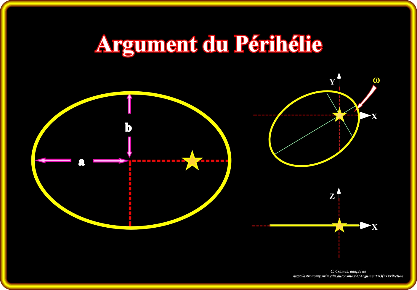 Comme indiqué plus haut l'argument du périhélie est l'angle entre le nœud ascendant et du périhélie d'une orbite autour du Soleil, mesurée dans le plan de l'orbite et dans la direction du mouvement orbital. L'argument du périhélie caractérise la direction de l'axe majeur de l'orbite autour du Soleil et est l'un des éléments clés des orbites. Les autres éléments sont : a) Longitude du nœud ascendant (Ω) ; b) Inclinaison ; c) Argument du périhélie (ω) ; d) Demi-grand axe (a) ; e) Excentricité (e) et f) Le nombre qui donne la position d'une planète en orbite à un moment donné. Cela peut être le moment de passage au périhélie, T (ou τ), la longueur du temps, L, ou l'anomalie moyenne à l'époque, M. Pour une comète, par exemple, avec une orbite très excentrique, le demi-axe est, généralement, remplacé par la distance du périhélie, q. En fait, l'orientation d'une orbite elliptique peut être caractérisée par trois éléments orbitaux : (i) Inclinaison ; (ii) Nœud ascendant et (iii) Argument du périhélie. En supposant qu'un corps céleste a une orbite elliptique avec une certaine excentricité (e) et un demi-grand axe (a), le périhélie est le point le plus proche entre le corps céleste en orbite autour (par exemple, une planète) et foyer occupé. Le Soleil est situé dans un foyer de l'orbite des planètes, tandis que l'autre foyer est libre. Si vous faites pivoter l'orbite autour du foyer occupé, l'axe de rotation est l'argument du périhélie (ω), telle que décrite sur ce schéma. Pour les orbites elliptiques autour d'autres corps célestes, l'argument du périhélie peut être remplacé par : (i) Argument du périastre (orbite autour de l'étoile) ; (ii) Argument du périgée (orbite autour de la Terre) ou (iii ) Argument du périapside (orbites autour de quelque chose d'autre). Dans le diagramme de gauche est illustrée une orbite elliptique avec une demi-axe grand (a) et un semi-axe petit (b) et foyer (étoile). La figure en haut représente une orbite vue de dessus de l'axe Z, qui a tourné d'un certain angle qui souligne l'argument du périhélie autour de l'axe Z. Dans le schéma inférieur, à droite, la même orbite est observée le long de l'axe Y.