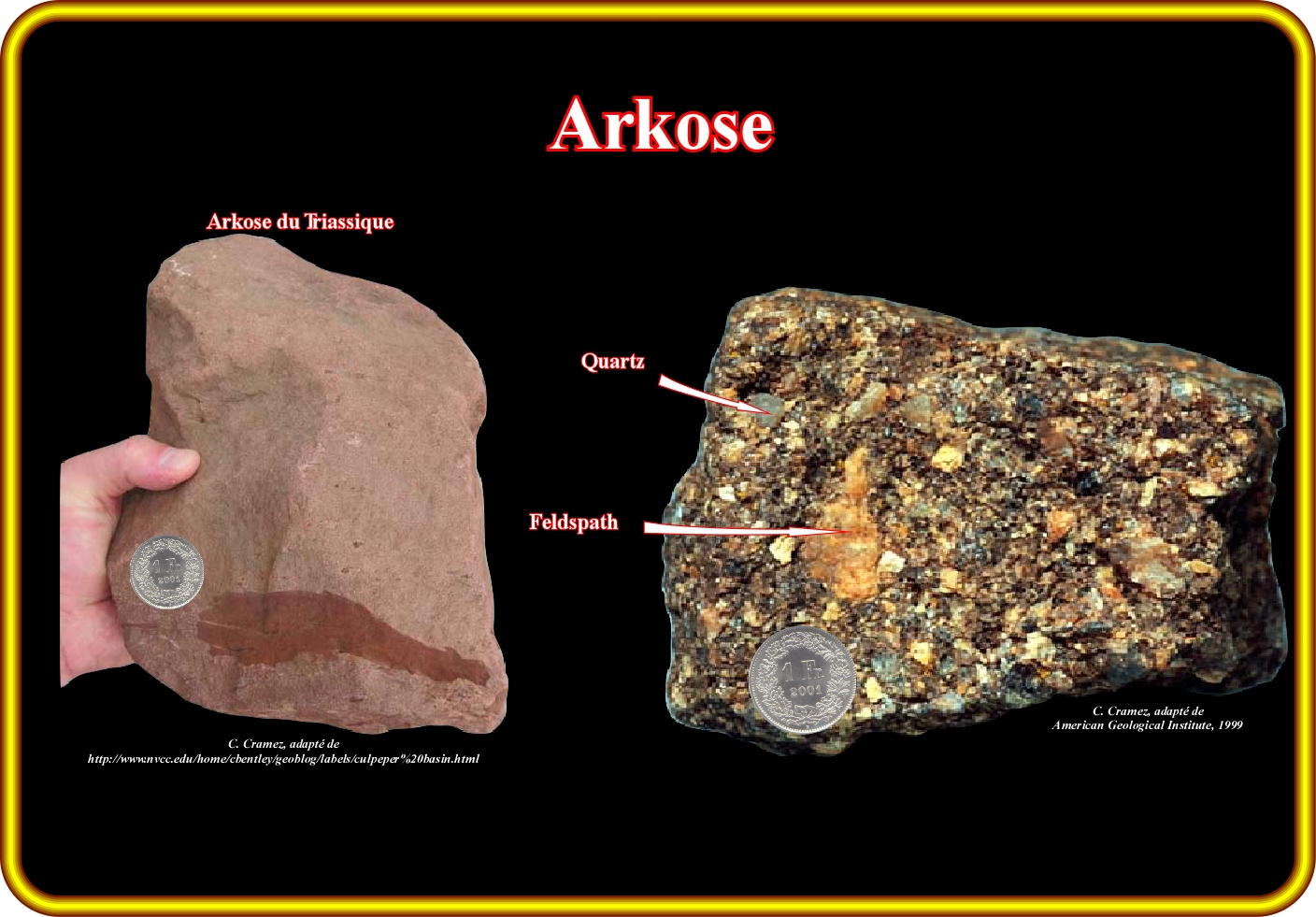 L'arkose est une roche sédimentaire que correspond, plus ou moins, à un grès riche en feldspath. Normalement, l'arkose a une granulométrie relativement grossière et une couleur rose ou rouge (comme l'arkose triasique illustrée sur cette figure). Typiquement, l'arkose est constituée de grains anguleux ou sub-anguleux, provenant directement de la désintégration rapide d'un granite ou de roches granitiques. Les grains peuvent être peut ou modérément calibrés. Le quartz est, généralement, le minéral dominant. Les feldspaths représentent environ 25% des composants. Le ciment (silice ou calcite) est, généralement, rare. La matrice (en général moins de 15%) comprend des minéraux argileux (kaolinite), mica, oxyde de fer et des fragments de roche. Certains auteurs considèrent que l'arkose a les caractéristiques suivantes : (i) Semblable à un grès riche en feldspath (des micas peuvent être, plus ou moins, présentes) ; (ii) La stratification est parfois visible ; (iii) Les fossiles sont rares ; (iv) Légèrement effervescent dans l'acide chlorhydrique dilué, ce qui indique un ciment à base de une calcite ; (v) Couleur, généralement, lustrée, brune grise ou rose ; (vi) Texture et taille des grains moyenne (2 mm, 1 / 16 en moyenne), pouvant être plus petite ; (vii) Dérive d'une altération rapide, transport et dépôt de débris de roches granitiques ; (viii) Les débris granitiques, qui forment les arkoses, sont déposés très rapidement dans des environnements froids ou secs vu que les feldspaths ne souffrent aucun changement chimique ou décomposition importante (ceci explique pourquoi les arkoses sont considérées comme des roches sédimentaires immatures). Les arkoses sont, souvent, associées à des dépôts conglomératiques formés à partir de terrains granitiques. Les arkoses se trouvent, souvent, au-dessus des discordances sus-jacentes aux terrains granitiques. Une arkose peut, parfois, être confondue avec un grauwacke. Toutefois, les environnements de dépôt d'une arkose et d'un grauwacke sont totalement différentes. Tandis qu'un grauwacke se forme dans un environnement sédimentaire d'eau profonde, en association avec des courants de gravité (systèmes de dépôt turbiditique), l'arkose se dépose, en général, en amont ou près de la ligne de côte, dans un environnement qui est non-marin ou d'eau peu profonde.