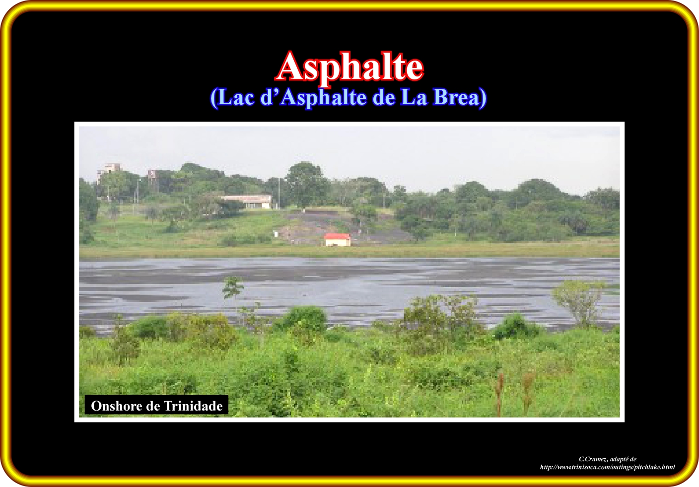 Dans l'onshore de Trinidade, près de la capitale Port de Espagne, le village de La Brea est célèbre pour son lac d'asphalte, lequel est l'un des trois lacs d'asphalte naturel plus importants au monde. C'est ce lac d'asphalte qui a donné le nom au village, car en espagnol, "brea" signifie sable ou grès asphaltique. Les réserves restantes de ce lac sont entre 6 et 10 Mt, ce qui, au rythme de production actuel, donne de réserves pour environ 400 ans. Les autres lacs d'asphalte importants sont : (i) «La Brea Tar Pit" en Californie et (ii) les "Menes" au Venezuela, où il y a plusieurs lacs d'asphalte avec des dimensions importantes. Ce sont ces lacs qui ont conditionné la recherche pétrolière dans ce pays. En effet, au Venezuela, la plupart des réserves de huile non-lourd ont été découverts par le forage des "Menes" ou des zones environnantes. Beaucoup d'asphaltes apparaissent comme des imprégnations visqueuses dans les grès, siltites, sables et calcaires. Dans la plupart des cas, ces imprégnations sont considérées comme des anciennes roches-réservoir d'huile, dans lesquelles les composants plus légers (constituants les plus volatils) ont disparu le long de la migration ou dès quelles ont été exhumées. Asphaltes, relativement, purs sont connus en Californie. Les exsudations d'asphalte sont connus depuis longtemps dans diverses parties du monde. Il y a plusieurs références dans l'Ancien et Nouveau Testament. Les plus grandes et plus connues sont celles du Venezuela et Trinidade. L'asphalte peut être extrait du pétrole en quantités commerciales par l'élimination des composants volatils. Ainsi, il est un matériau de construction (cimentation et l'étanchéité) bon marché. Trois types de l'asphalte sont extraits des résidus de l'huile : (i) Celui utilisé dans le revêtement des routes (écoulement presque visqueux) ; (ii) Celui utilisé pour isoler les toitures, revêtement des tuyaux, peinture et papier laminé (faible viscosité) et (iii) Celui avec des applications très limitées, vu que sa viscosité est dépendante de la température.