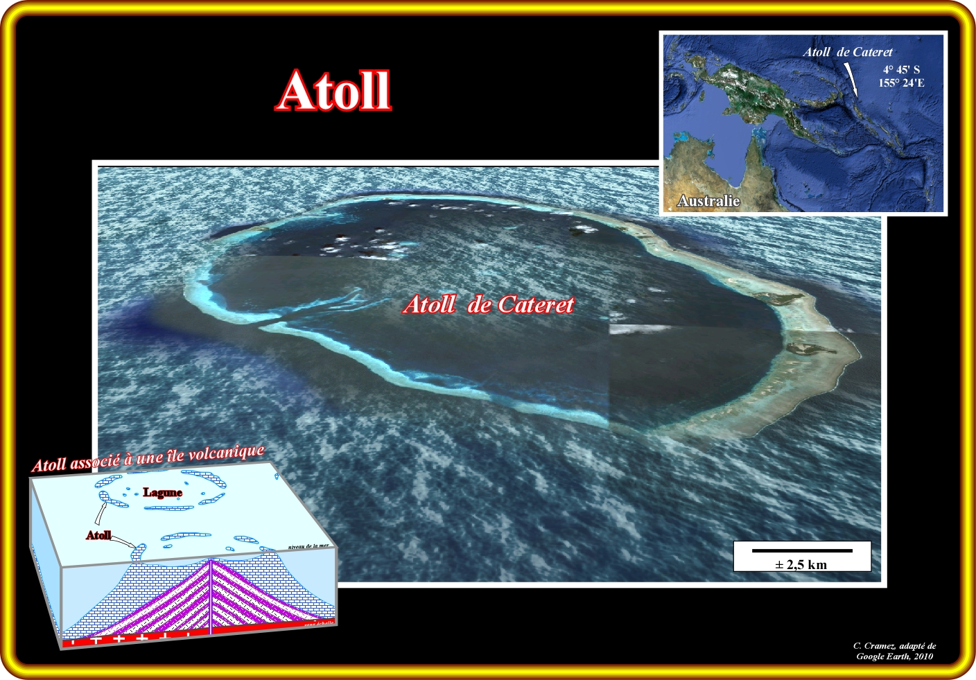Comme illustré ci-dessus, en plan, un récif de corail apparaît comme un d'anneau ou en fer à cheval, qui émerge de l'eau profonde et ferme partiellement un lagon (c'est pourquoi les atolls sont, parfois, appelés îles lagunaires). Comme les atolls sont le résultat de la croissance des organismes marins tropicaux, ils se trouvent uniquement dans les eaux chaudes tropicales. La formation de la majorité des atolls peut être résumée ainsi : (i) Les coraux s'installent et se développent autour d'une île océanique, en général, volcanique, formant un récif frangeant ; (ii) Dans des conditions favorables, le récif s’élargit et l'intérieur de l'île submerge ; (iii) Éventuellement, l'île est engloutie complètement, laissant une frange de corail en surface que continue à se développer avec un lagon, plus ou moins, ouvert dans la partie centrale. Quand une île volcanique, située dans une zone où la température est suffisamment chaude pour permettre une croissance des récifs que compense la subsidence, on dit qu'île est dans le point de Darwin. Au contraire, quand elle est située en dehors des régions favorables au développement des coraux, elle est, partiellement, érodée et peut submerger criant un mont sous-marin. La répartition des atolls est très instructive. La plupart des atolls est localisée dans l'océan Pacifique, avec des concentrations importantes dans l'archipel des Tuamotu (Rangiroa 1762 km^2 avec une superficie terrestre de 79 km^2), Caroline, Marshall, Mer de Corail et en groupes d'îles comme celui de Kiribati, Tuvalu et Tokelau. Dans l'océan Indien, les atolls les plus importants sont ceux des Maldives (Ari avec 2252 km^2 et une superficie terrestre de 69 km^2, Malé Nord avec 1565 km^2 et une superficie de 69 km^2 et Huvadhu avec 3152 km^2 dont 38,5 km^2 correspondent à la surface terrestre), les îles Laquedives, l'Archipel des Chagos (12642 km^2, où la superficie des terres est seulement de 4,5 km^2) et les îles extérieures des Seychelles. L'Atlantique n'a pas de grands d'atolls, sauf les huit atolls à l'Est du Nicaragua. Dans la plupart des cas, la superficie terrestre d'un atoll est très faible par rapport à la superficie totale.