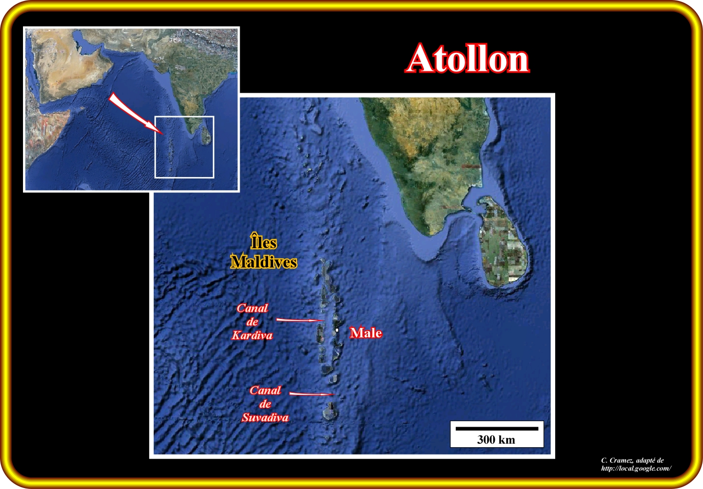 Dans cette figure, on reconnaît clairement les différents atolls enchaînés qui forment l'atollon des Maldives. Chaque atoll correspond à une île basse, formée par un récif de corail en forme d'anneau continu ou interrompu par de petits chenaux, qui entourent un lagon central peu profond. Dans le fond du lagon se développent des coraux en forme de pinacle ou sphériques. Dans le bord externe, sur la plate-forme du récif, émergent des bancs de sable coralligène que forment des îlots ou se disposent en bermes de plage dû au déferlement des vagues. Dans la morphologie de la plate-forme d'atoll, parfois, on peut mettre en évidence des blocs de calcaire taillés en champignon ou en forme de tête. Lorsque les canaux entre les îles du récif sont profonds, ils permettent de navigation et forment des canaux de passage (canal Kardiva et Suvadiva). Dans l'histoire géologique, de nombreux atolls meurent au cours de montées relatives du niveau de la mer. En effet, la survie des atolls et par conséquence d'un atollon, implique que la croissance des coraux compense la montée relative du niveau de la mer (action combinée de tectonique, c'est-à-dire, soulèvement ou subsidence et de l'eustasie) pour que la profondeur de l'eau dans laquelle les coraux se développent soit plus ou moins constant. Cas contraire, les coraux se trouveront sous une grande tranche d'eau et, peu à peu, mouriront, surtout si la montée relative du niveau de la mer est, principalement, contrôlée par la subsidence que par l'eustasie (dans ce cas, le taux de subsidence est plus rapide que le taux de l'eustasie). Le même principe s'applique aux plates-formes carbonatées, ce qui, d'ailleurs, a créé dans l'analyse séquentielle un enjeu majeur de discorde entre l'école de Vail et celle de Schlager. Vail considère qu'une discordance (surface d'érosion que limite les cycles stratigraphiques) est toujours associée à une chute relative du niveau de la mer que provoque l'exhumation des plate-forme calcaires et donc la mort des coraux. Schlager considère que dans les plate-formes calcaires, certains des discordances de Vail, ne correspondent pas a une chute relative du niveau de la mer, mais, au contraire, correspondent à des montées relatives importantes que placent les plate-formes au-dessous de la zone photique, ce que empêche la formation de carbonate. Ainsi, dans ce cas, il n'y a pas de surface d'érosion (limite de cycles stratigraphiques), mais une surface de noyade.