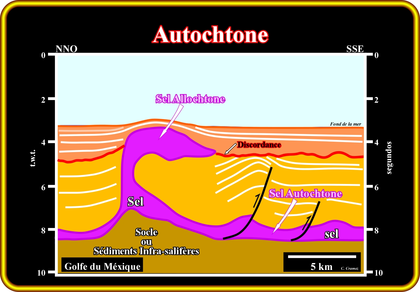 Dans cette tentative d'interprétation géologique d'une ligne sismique de l'offshore profond du Golfe du Mexique, il est facile de distinguer le sel allochtone et autochtone. Le sel autochtone est dans sa position stratigraphique originelle de déposition, tandis que le sel allochtone non. Dans cet exemple, les deux horizons salifères communiquent à travers une structure salifère verticale, mais de nombreuses fois, ils sont séparés par des sutures salifères subverticales (sans sel). Il peut avoir plusieurs ordres de allochtonie. En certains bassin salifères, peuvent exister des dômes de deuxième ou troisième génération, c'est-à-dire, des dômes salifères formés à partir d'un niveau salifère allochtone de 1ère ordre (dôme de 2e génération) ou d'un niveau salifère de 2e ordre (dôme de 3e génération). Notons que dans cette tentative la discordance, qui a été, localement, renforcée par la tectonique n'a pas été induite par halocinèse (tectonique salifère), mais par un régime tectonique compressif régional (compensation de l'extension des sédiments de la plate-forme et du talus supérieure), lequel a raccourci (compressé) les sédiments abyssaux ainsi que le sel. Comme illustré dans cette tentative d'interprétation, les sédiments du fond de la mer sus-jacents à la structure salifère allochtone ont été allongés (et non raccourcis) par le mouvement diapirique du sel. Cet allongement est le résultat d'un régime tectonique extensif, qui s'est développé, au fur et à mesure, que le sel se déplaçait vers les niveaux stratigraphiques supérieurs. L'allongement des sédiments se fait, uniquement, par des failles normales, que dans ce cas particulier sont, plus ou moins, radiales autour de la structure salifère et avec une polarité opposée. Toutefois, ces failles normales ne sont pas représentées dans l'interprétation, parce que le déplacement relatif des blocs faillés est inférieur à la résolution de ligne sismique. La structure sur le fond de la mer, même si elle est convexe vers le haut (en forme de cloche), ne correspond pas à une structure anticlinale (structure compressive), mais un antiforme qui est une structure extensive créée par un régime tectonique extensif local. En outre, l'antiforme du fond de la mer est plus récente que les structures compressives (anticlinaux et failles inverses) visibles sous la discordance. Les sédiments sous la discordance ont été raccourcis, tandis que les sus-jacents ont été allongées.