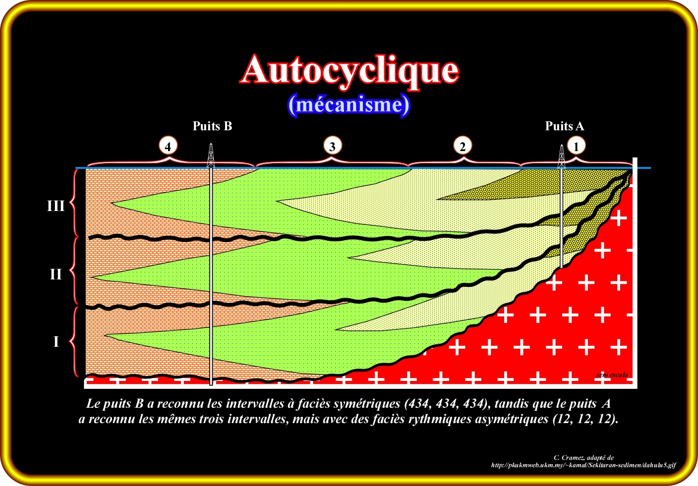 En géologie, comme illustré dans cette coupe géologique, basée sur une tentative d'interprétation géologique d'une ligne sismique calibrée par deux puits d'exploration, les processus autocycliques (qui font partie intégrante du système géologique) sont très fréquents. Ils existent dans les systèmes fluviaux (taille et configuration du chenal de la rivière), systèmes de glaciaires (développement des glaciations et dépôts glaciaires), systèmes de déposition marins, etc. En fait, l'extension maximale d'une glaciation correspond, la plupart du temps, à la période la plus froide. Cependant, pour chaque type d'événement glaciaire, la séquence réactionnelle est d'autocyclique : (i) Un réchauffement rapide termine un long épisode de refroidissement (avec une plus grande sensibilité des basses latitudes aux causes externes) ; (ii) Un apport d'humidité d'un océan libre de glace est une condition, sina qua non, pour bâtir des édifices glaciaires ; (iii) L'extension syngénétique du désert polaire vers l'équateur est un facteur que limite le dépôt de glace, etc. L'accumulation de strates dans les systèmes sédimentaires est le résultat de l'interaction de processus autocycliques (autogènes) et allocycliques (allogènes). Les processus allocycliques sont mieux compris que les autocycliques et parmi eux on peut citer le climat, eustatisme, tectonique, les variations du niveau des mers, etc. Comme les caractéristiques et importance des processus autocycliques sont peu connus il est difficile de les déduire à partir des systèmes sédimentaires. C'est pourquoi certains géoscientistes font toute une série d'expériences afin de découvrir les principaux facteurs interactifs. Récemment, l'évolution autocyclique a été évaluée, séparément, pour trois types différents de systèmes sédimentaires : cônes alluviaux, deltas et deltas de marée.