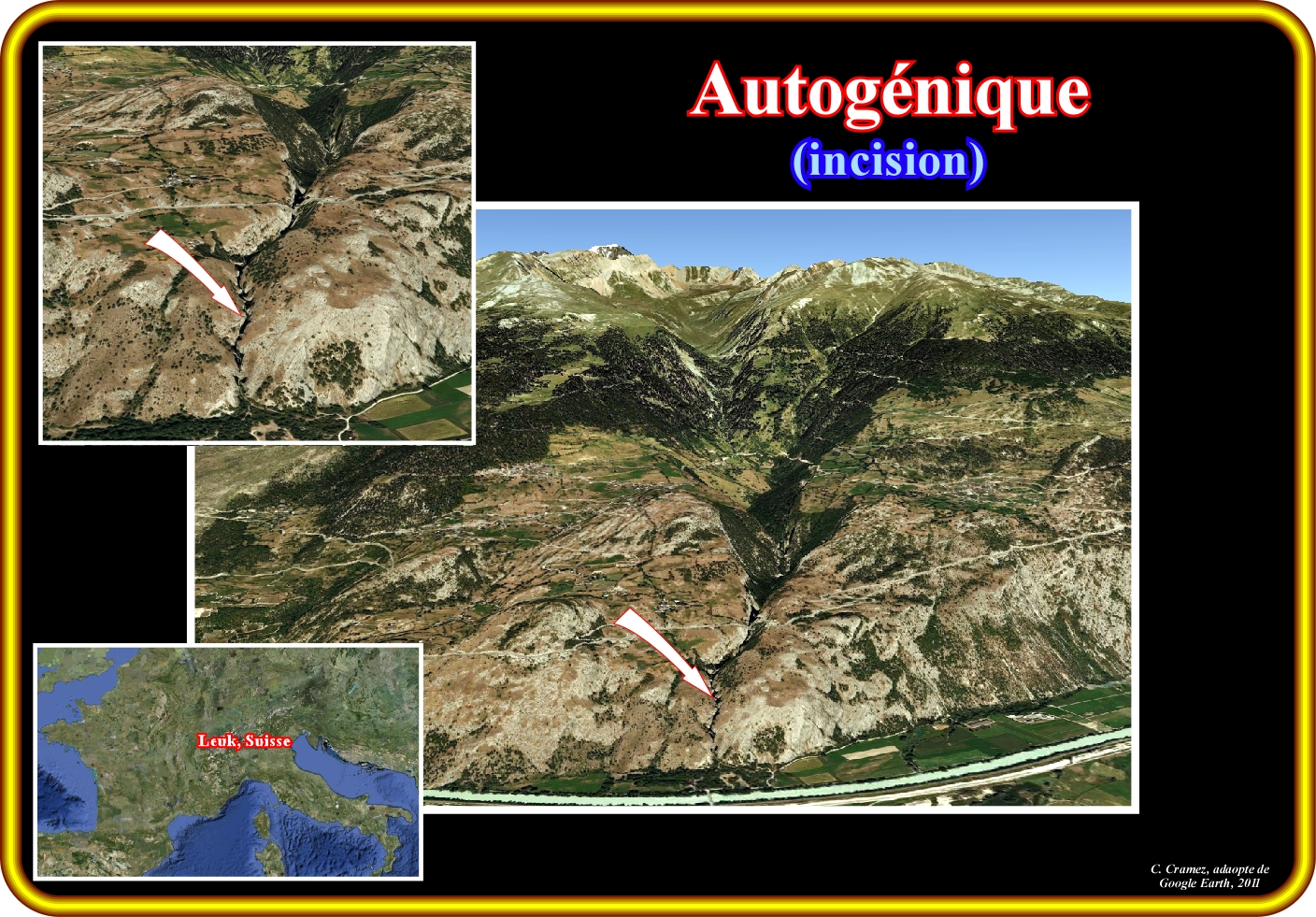 Bien que l'incision illustrée dans cette photo puisse être considérée comme autogène, dans ce cas particulier, le courant d'eau, qui a érodé le substratum rocheux, s'est localisé et a accentué son action le long d'une zone de faiblesse des roches induite par le déplacement relatif des blocs faillés d'une faille normale. Les incisions autogéniques sont, plus souvent, associées à des chutes relatives du niveau de la mer, induites par l'action combinée de l'eustasie et tectonique (soulèvement ou subsidence). En réalité, au moment d'une chute relative du niveau de la mer, la ligne de côte et les dépôts côtiers se déplacent vers la mer. Ainsi, si la chute relative du niveau de la mer est importante, il peut arriver que toute la plate-forme continentale soit exhumée et que la nouvelle ligne de rivage se situe sur le talus continental supérieur. Un tel déplacement de la ligne de côte que peut atteindre des centaines de kilomètres, déplace, également, l'embouchure des fleuves vers l'aval et vers le bas (vers le bassin), ce qui provoque la rupture des profils d'équilibre provisoire des cours d'eau. Ainsi, les fleuves sont forcés à creuser (incision autogène) leurs lits et la plate-forme exhumée afin que des nouveaux profils d'équilibre provisoire soient atteints (les profils d'équilibre finaux ne sont jamais atteints). Plus tard, lorsque le niveau relatif de la mer commence à monter et avant que la première surface transgressive inonde la plate-forme exhumée, les vallées incisées (incisions autogènes) sont remplies de sédiments, généralement, par des sables et argiles, contemporaines des prismes de bas niveau déposés en aval du rebord du bassin. C'est le remplissage des vallées incisées, qui, souvent, permet aux géoscientistes de localiser les discordances (surfaces d'érosion induites par les chutes relatives du niveau de la mer significatives), qui limitent les différents cycles stratigraphiques qu'ils soient d'empiétement continental ou d’hiérarchie inférieure. En réalité, en amont du rebord continental, qui peut ou non correspondre au rebord du bassin, en particulier lorsque les discordances n'ont pas été renforcées par la tectonique (discordances angulaires), les surfaces d'érosion sont difficiles à reconnaître, en particulier, sur les lignes sismiques.
