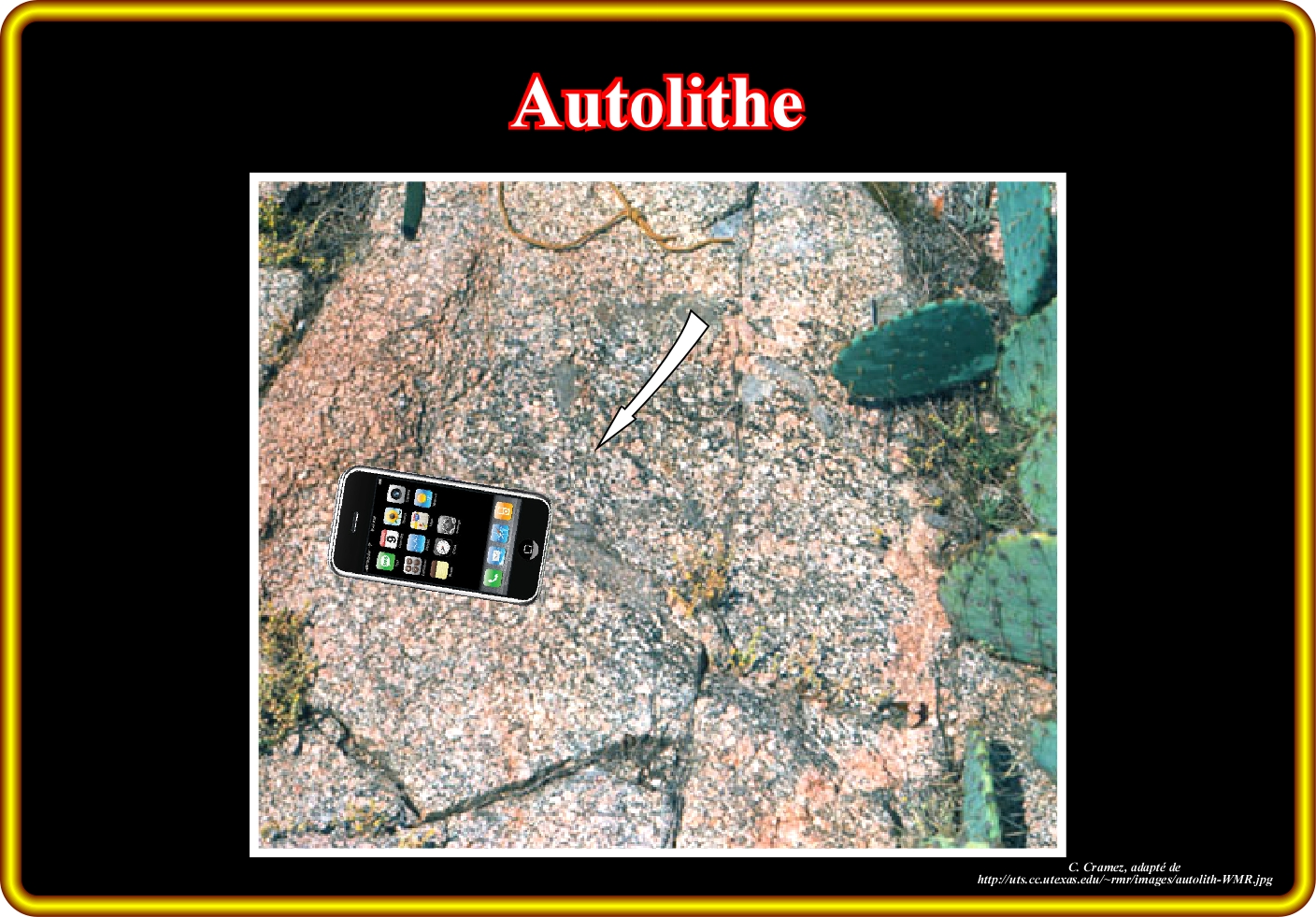 L'inclusion visible sur cette photographie d'un granite porphyrique est un autolithe riche en biotite, ce qui suggère deux phases distinctes dans la formation du granite. La première, représentée par un granite sombre était suffisamment compétente pour se fracturer, tandis que la deuxième était été encore, plus ou moins, liquide pour pouvoir être incorporer dans la première (autolithe). Pour certains géoscientistes les autolithes sont xénolithes (fragments de roches qui sont incorporés dans une roche plus importante pendant la phase terminale de développement ou consolidation). Pour d'autres, les xénolithes sont inclusions non dérivées du même magma et, parfois, ils correspondent à des roches très différentes. Ainsi, pour eux, quand un fragment de calcaire se trouve dans une roche volcanique, le terme autolithe n'est pas appropriée pour le nommer, une fois qu'il a une origine et composition totalement différente (en général, il est arraché aux parois des fissures rocheuses que le magma volcanique a utilisé pour arriver en surface. Dans ce cas, il est préférable de dire que le fragment de calcaire est un xénolithe de la roche volcanique. La même chose s'applique à certaines roches granitiques, tels que les migmatites, dans lesquelles nous pouvons reconnaître xénolithes de roches sédimentaires, plus ou moins, métamorphisés et granitisées. En fait, tous les roches granitiques sont le résultat de la cristallisation d'un magma. Dans certains cas, les roches sédimentaires peuvent être enfouies à grandes profondeurs et granitisées. Cela signifie que dans ce cas (granitisation) la formation de granite ou de roches semblables se fait par des processus métamorphiques, par opposition aux processus ignés dans lesquels les granites sont formées à partir d'un magma (liquide) de composition sialique. Dans la granitisation, les sédiments sont transformés à l'état solide ou, partiellement fondus, par des processus qui nécessitent l'ajout et suppression de divers composants, transport de vapeur ou mouvement de solutions aqueuses. Ainsi, dans le premier cas, les inclusions sont des autolithes, mais pas le second, elles sont simplement des xénolithes.
