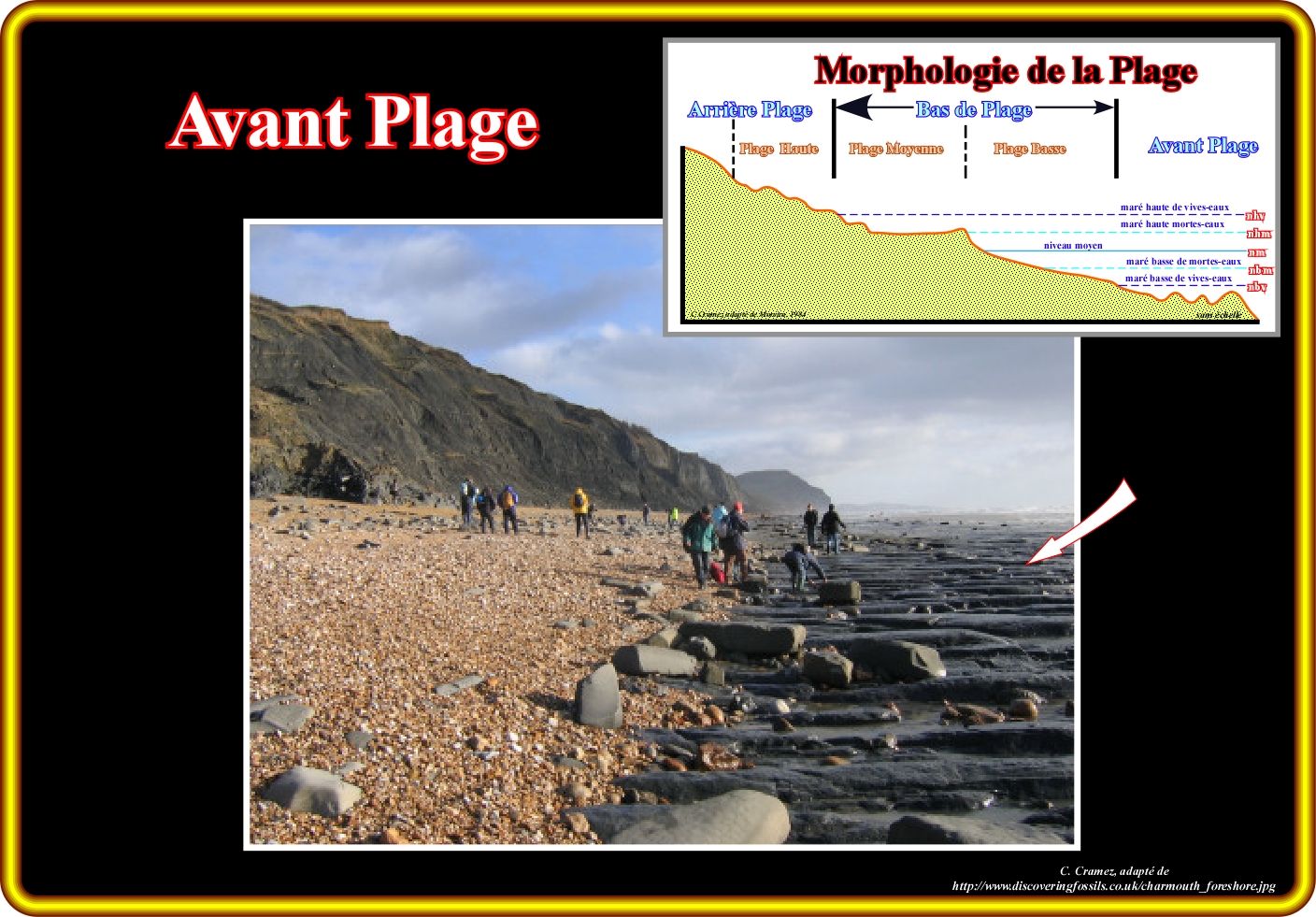 De nombreuses zones côtières, en particulier celles qui ont une lithologie silicoclastiques, ont une morphologie similaire à celle illustrée dans ce schéma. La zone avec une géométrie, plus ou moins, concave, entre la ligne de marée haute et une profondeur d'eau de 5 - 20 m, est le bas de plage, qui comprend, évidemment, la plage intertidal. En aval du bas de plage, la mer forme une rampe qui descend doucement vers le bordure continental (avant plage). Dans le bas de plage, il y a des crêtes et sillons induis par le déferlement des vagues. La plage intertidale (bas de plage) se situe entre les lignes de marée haute et marée basse, tandis que l'arrière plage s'étend depuis la ligne de marée haute jusqu'au début des dunes. Dans l'arrière plage il y a une ou plusieurs bermes qui ressemblent à de petites terrasses avec des faibles talus du côté de la mer. Pendant une montée relative de la mer, la morphologie des plages détermine, en partie, l'amplitude de l'empiétement côtier, c'est-à-dire, la composante horizontale de l'aggradation côtière. Autrement dit, si la morphologie des plages est relativement plate, une montée relative du niveau de la mer d'environ 10 m déplacera, vers l'amont, la rupture côtière de l'inclinaison de la surface de déposition (plus ou moins de la ligne de côte) de plusieurs kilomètres. Au contraire, si la morphologie des plages est relativement inclinée vers la mer, la même montée relative du niveau de la mer déplacera, vers l'amont, la rupture d'inclinaison (et les dépôts côtiers associés) de quelques centaines de mètres. Lorsque le niveau relatif de la mer descend, le déplacement vers la mer et vers le bas de la rupture côtière de l'inclinaison de la surface de déposition est également fonction de la morphologie de l'arrière plage, bas de plage et avant plage. Dans la stratigraphie séquentielle, il est important de calculer la valeur des composantes (verticale et horizontale) de l'aggradation côtière pour connaître la morphologie des plages.