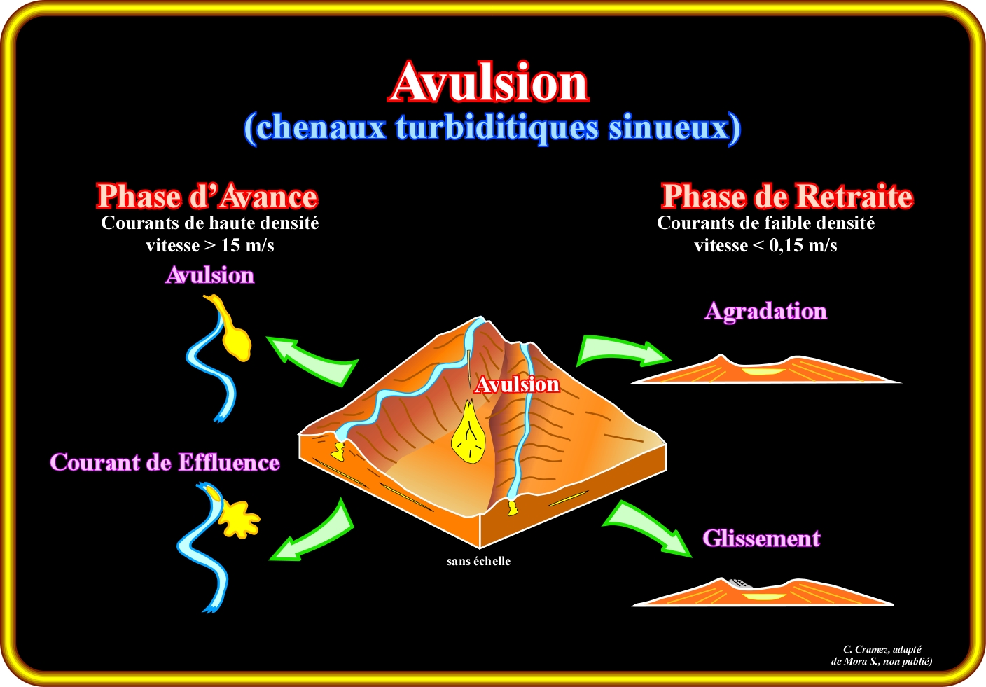 Avant tout, il est important de se rappeler que le terme «chenal turbiditique" est abusif et crée beaucoup de confusions. La genèse d'un chenal turbiditique ne correspond en rien à celle d'un chenal fluviatile, comme un courant turbiditique ne correspond pas à un cours d'eau fluvial. Un cours d'eau, comme une rivière, nécessite un lit au long du quel l'eau s'écoule. Ainsi, quand une rivière déborde, des digues marginaux naturelles se forment au-dessus de la base lit. Un courant turbiditique n'a pas besoin d'un lit pour s'écouler. Toutefois, au fur et à mesure, qu'un courant turbiditique ralentit le matériel transporté se dépose dans deux lobes latéraux et, dans la partie distale (en aval), il forme un lobe terminal. L'espace entre les deux lobes latéraux (appelé, souvent, «canal turbiditique") est, en effet, le lieu de passage de la partie la plus rapide du courant, qui en ralentissant dépose le matériel, encore transporté, plus en aval. Si vous allez à la plage, remplissez le seau avec lequel votre enfant, ou même vous, jouez, avec du sable et eau et lancé le contenu sur la plage. Vous constaterez que le contenu sableux se dépose sous la forme de deux lobes latéraux séparés par une zone où rien ne s'est déposé. Si vous répétez cette opération plusieurs fois, jetant toujours le contenu, plus ou moins, sur le même endroit, vous pourrez constater que, peu à peu, les lobes latéraux se superposent exagérant, ainsi, la zone sans déposition entre eux. Vous constaterez, également, qu'il n'y a, pratiquement, pas d'érosion entre les lobes et que, progressivement, les courants, que vous formez quand vous lancez le contenu du seau sur la plage se chenalisent, c'est-à-dire, ils sont obligés de passer par la dépression entre les lobes. L'avulsion est très répandue dans les cônes sous-marins de talus, lorsque le courant de turbidité dépasse la capacité de passage de la dépression formée entre les digues marginales naturelles. Durant la phase d'avance (progradation, courants de densité et hautes vitesses), les avulsions et courants de débordement sont prépondérants. En revanche, durant la phase de retrait (rétrogradation, courants de densité et vitesses faible), l'aggradation et les glissements de terrain sont dominants. C'est au cours de la phase de retrait que, la grande majorité des dépressions entre les digues marginales naturelles sont remplies.