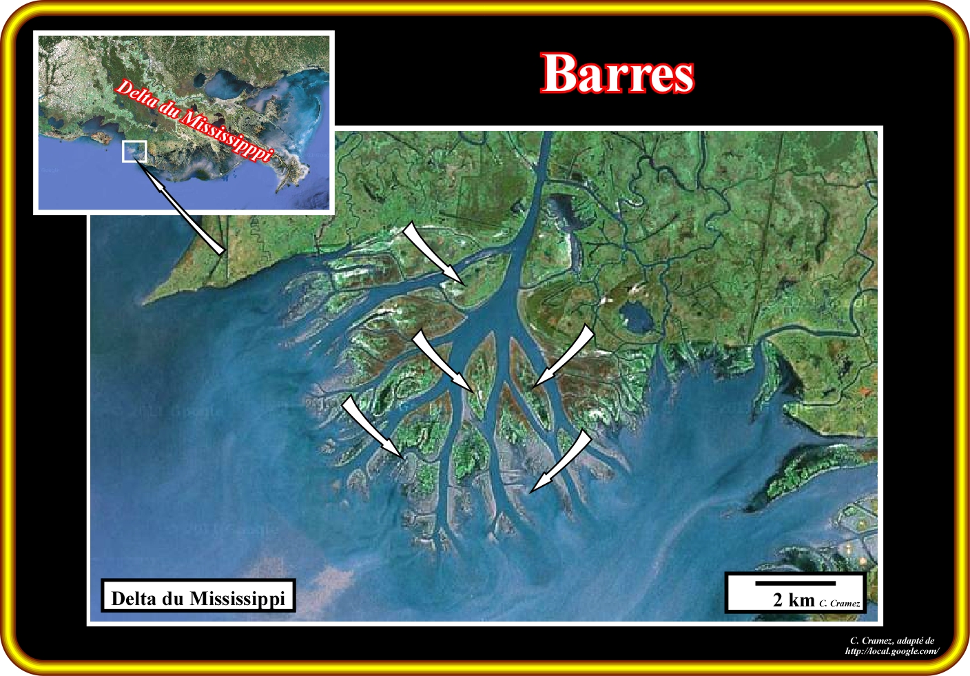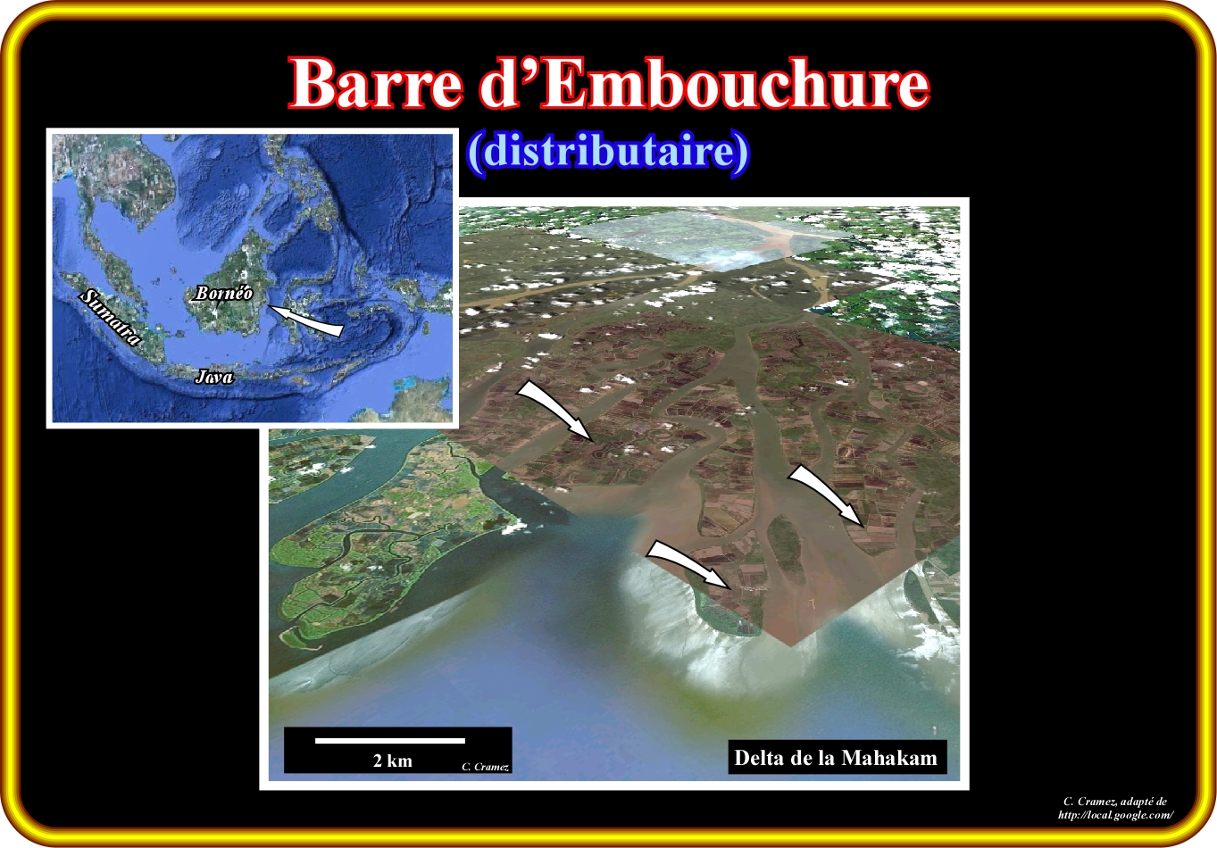 Cette photographie montre un exemple d'un complexe de barres, dans ce cas, de barres d'embouchure, localisées en face d'un distributaire, partiellement, abandonné, du fleuve Mississippi. Dans les lignes sismiques conventionnelles, utilisées dans l'exploration des hydrocarbures, les barres sont à peine visibles, car ses dimensions sont, généralement, inférieures à la résolution sismique. Au contraire, sur les enregistrements électriques (diagraphies), qui ont une résolution très fine, les barres sont, facilement, reconnus par la géométrie des diagraphies du rayon gamma (GR) et potentiel spontané (PS), qui soulignent les caractéristiques strato et granocroissantes vers le haute des barres. Cette géométrie corrèle, presque toujours, avec la diagraphie de l'inclinaison (pendagemètre), ce qui suggère des inclinations de plus en plus fortes vers le haut, lesquelles soulignent une augmentation de l'énergie de dépôt. Dans les affleurements, comme dans les diagraphies, lorsque le système de dépôt est abandonné et fossilisé par des sédiments plus récents, la partie supérieure des barres peut, localement, être érodée par les distributaires. Les canaux par où les distributaires passaient sont remplis par les sédiments de faciès sableux ou argileux (le remplissage est, rarement, total). Dans les registres électriques, et en particulier dans la diagraphie de l'inclinaison, cette situation est, facilement, reconnue, car la géométrie granocroissante vers le haut des barres est remplacée par une géométrie granodécroissante vers le haut. Ce changement de géométrie souligne une surface d'érosion, autrement dit, une discordance. Le terme barre est, souvent, utilisé pour décrire le passage étroit d'un port fluvial. Ceci ne semble pas tout à fait correct, car la plupart des fois les vrais barres (accumulations) ont besoin d'être draguées pour permettre l'accès aux port fluviaux. En fait, c'est l'envasement du lit du fleuve et de l'embouchure du fleuve, provoquée par le dépôt des sables, que forme la barre. Ainsi, en géologie, la barre du fleuve Douro à Porto (Portugal), par exemple, est l'accumulation de sable et non passage que permet fleuve d'arriver à la mer.