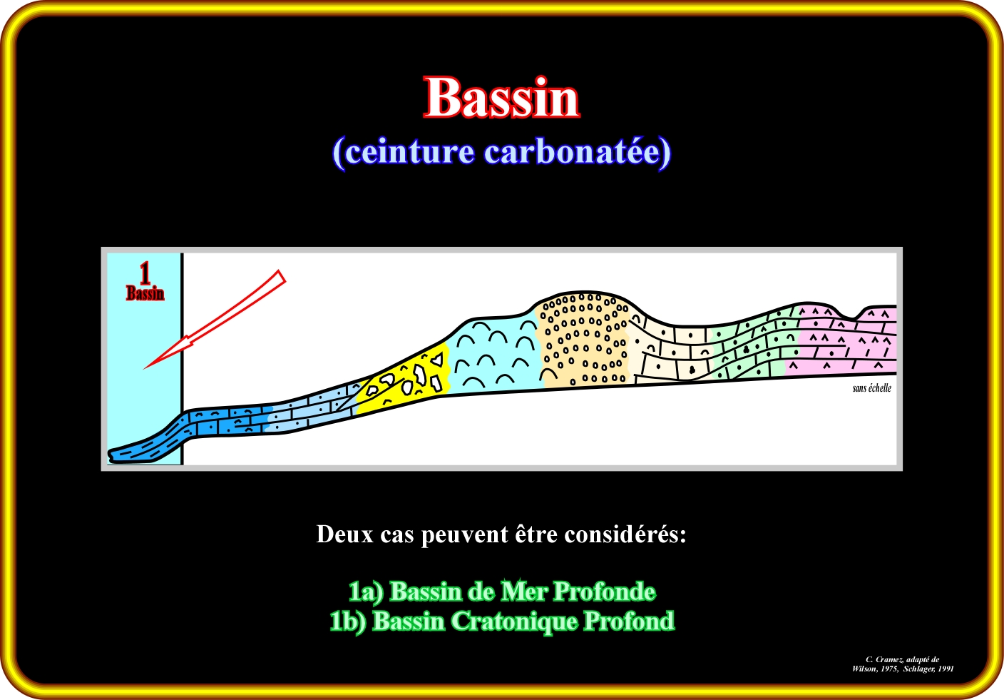 Dans une ceinture carbonatée, deux types de bassins sont fréquents : (i) Mer profonde et (ii) Cratonique profond. Les deux types sont caractérisés par contextes géologiques, sédiments et biota différents. Le bassin d'eau profonde est caractérisée par : (a) Un contexte géologique sous l'action des vagues et au-dessous de la zone euphotique, ainsi que d'une partie de la mer profonde, qui peut dépasser la thermocline ; b) Des sédiments pélagiques profonds comme l'argile, silice, biovase carbonatée, boue hemipelágique et turbidites ; c) Un biota (association de plancton océanique, à la proximité de la plate-forme continental, benthos des eaux peu profondes). Le bassin cratonique profond est caractérisée par : a) Un contexte géologique sous l'action des vagues et au-dessous de la zone euphotique, mais, normalement, il n'est pas lié à l'eau de mer profonde ; b) Des sédiments qui sont les mêmes que dans le bassin de mer profonde, cependant les bassins du Céno-Mésozoïque ont rarement de l'argile pélagique ; dans ce type, les boues hemipelágiques sont fréquentes et peuvent contenir de l'anhydrite et silex ; des conditions anoxiques sont fréquentes avec une forte teneur de matière organique ; c) Un biota formé, principalement, de necton et plancton, lumachelles bivalves et spicules d'éponges. Compte tenu de l'échelle verticale, sur les lignes sismiques, la différenciation et, même, l'identification de ces types de bassins carbonatés est difficile. Toutefois, lorsque les lignes sismiques sont de bonne qualité et calibrées par un ou plusieurs puits d'exploration, qui ont reconnu la ceinture carbonatée, les environnements de la ceinture peuvent être reconnus au bout de deux ou trois tentatives d'interprétation. N'oublions pas qu'il y a différents types de plates-formes carbonatées : (1) Plates-formes auréolées, bordées de récifs coralliens ou des bancs récifaux dans le rebord de la plate-forme ; (2) Plate-formes de type rampe avec des sables carbonatés, près de la ligne de côte et des sables argileux et boues d'eau profonde, à la base de la rampe et sans récifs importants ; (3) Plates-formes de mer épirique (calcaire) avec des surfaces de marée et lagunes protégées; (4) Plates-formes isolées avec des récifs et sable, sur la rive au vent et sédiments vaseux dans la marge sous le vent ; (5) Plates-formes mortes, quand elles sont sous la zone photique.