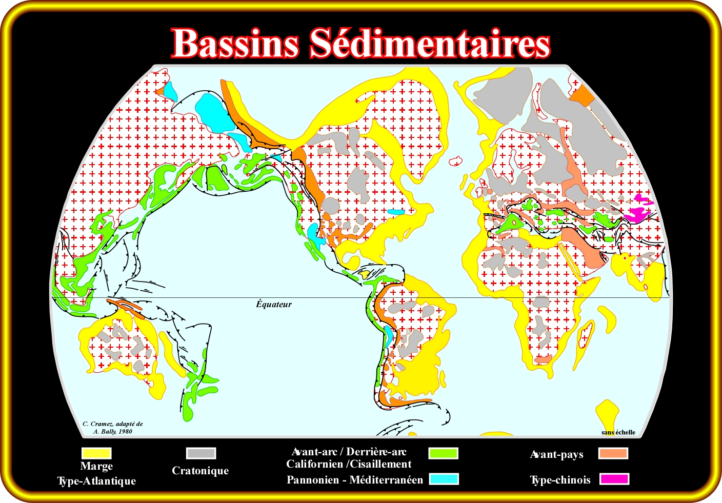 Cette carte illustre la répartition des différents types de bassins sédimentaires du Méso-Cénozoïque admis dans la classification de Bally et Snelson (1980), laquelle est, principalement, basée sur la subsidence. Ces géoscientistes reconnaissent deux grands types de bassins : (i) Les bassins non associés avec la formation de mégasutures et (ii) Les bassins associés avec la formation de mégasutures. Dans le premier cas, existent trois types principaux : (a) Bassins cratoniques qui se développent dans la croûte continentale ancienne et qui, généralement, sont créés par une subsidence thermique locale ; (b) Les bassins de type-rift qui sont créés dans la croûte continentale par une subsidence différentielle, lorsque la croûte est, localement, allongée et (c) Les marges continentales de type-Atlantique qui se développent au-dessus des bassins de type-rift, en combinaison avec une subsidence thermique, dès la rupture de la lithosphère. Dans les bassins sédimentaires associés avec la formation de mégasutures, il y a deux grandes familles : (1) Les bassins périsuturaux qui se développent à la périphérie des mégasutures en liaison avec une zone de subduction de type-A ou B, comme, les bassins d'avant-fosse (avant-pays) et les bassins d'avant-arc et (2) Les bassins épisuturaux qui se développent à l'intérieur des mégasutures, comme, les bassins d'arrière-arc. L'extension en arrière arc peut être très importante et créer une océanisation, c'est-à-dire, une rupture de la lithosphère avec formation d'une mer marginale, où se développe une marge divergente de type non-Atlantique (formation de croûte océanique nouvelle). Une des différences entre les marges divergentes de type-Atlantique et non-Atlantique c'est que les deuxièmes se développent dans un contexte globalement compressif, c'est-à-dire, à l'intérieur des mégasutures, tandis que les premières se forment à l'extérieur des mégasutures (contexte extensif).