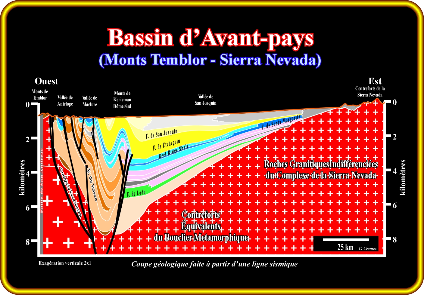 Cette coupe géologique, basée sur une ligne sismique régionale, entre la faille de San Andreas et les contreforts de la Sierra Nevada (USA), illustre un coin clastique (bassin d'avant-pays) créé par la subsidence flexurale induite par la surcharge des chevauchements responsables de la formation des monts Temblor. C'est dans ce type de bassin, associé à une subduction de type-A (Ampferer) et créée par une subsidence flexurale, que certains principes de l'analyse séquentielle sont questionnés. En effet, l'analyse séquentielle de l'école de Vail (Exxon) admet que l'eustasie est le principal facteur de la création d'espace disponible pour les sédiments (accommodation) et que la subsidence a un rôle secondaire. Cela signifie que la cyclicité des dépôts sédimentaires observée sur le terrain, données sismiques et diagraphies électriques est induite par les variations eustatiques et non pas par des changements tectoniques. Cette conjecture est très difficile à falsifier (réfuter) sur les marges continentales divergentes type-Atlantique (régimes tectoniques extensifs prédominants). Cependant, sur les marges convergentes, et, en particulier dans les bassins d'avant-pays (avant-fosses), les changements tectoniques sont beaucoup plus rapides et, ainsi, est possible que le rôle de la subsidence flexurale soit plus importante que celui admis par l'école de Vail. Il est important de ne pas oublier, que dans ce type de bassin, la subsidence est, principalement, créée par la charge des chevauchements qui forment la chaînes de montagnes, dont le soulèvement produit une source d'apport sédimentaire importante. En outre, avec la continuation du raccourcissement, les sédiments déposés dans l'ante-fosse sont progressivement raccourcis et inclus dans la chaîne de montagne. Cette progression de la chaîne de montagnes vers le craton produit une rétrogradation, en direction de craton, des renflement périphériques (zones de soulèvement et érosion dans la partie distale du bassin), qui caractérisent les bassins d'avant-pays. Dans certains bassins de ce type, des constructions récifales sont parfois associée à renflements périphériques.