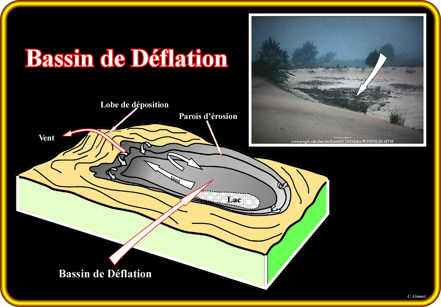 La photo en haut à droite de cette figure illustre un bassin de déflation, qui s'est formé dans la plaine inondable de la rivière Wisconsin (Spring Green, EUA). La genèse de ce bassin, comme celle de la grande majorité des bassins par déflation, est esquissée dans le bloc diagramme. Le mécanisme de formation peut être résumé comme suit : (i) La turbulence du vent érode, calibre et transporte les particules libres vers un lobe de dépôt ; (ii) Formation d'une dépression (bassin de la déflation), dans lequel, parfois, se forme un lac dans la partie la plus profonde, comme illustré ci-dessus. L'emplacement et géométrie des lobes de dépôt, par rapport au bassin de déflation, indique la direction, ampleur et direction du vent. Ainsi, un bassin de déflation peut être définie comme un bassin topographique creusé et entretenu par l'action érosive du vent, lequel élimine le matériel peu consolidé laissant autour de la dépression, normalement, des roches plus résistantes. Bien que ce type de bassin se forme, principalement, dans les zones arides ou semi-arides, il peut être trouvé dans d'autres environnements ou milieux sédimentaires. Comme indiqué plus haut, un lac, peu profond, peut occuper la partie centrale du bassin, pendant certaines saisons (lac de déflation). Une caractéristique importante de ces bassins, c'est qu'ils sont fermés et peu profonds. Un bassin de déflation peut collecter l'eau ou intercepter, dans sa partie inférieure, un niveau d'eau souterraine. Le terme bassin est utilisé, uniquement, lorsque la taille de ces dépressions dépasse quelques dizaines de mètres avec une profondeur supérieure à 2 - 3 mètres. Dans d'autres cas, il est préférable de parler de creux de déflation. Comme dans le cas d'une barre de méandre (érosion et dépôt simultanés), il est clair que l'érosion induite par le vent ne correspond pas à une discordance, une fois que la surface d'érosion est locale et contemporaine du dépôt du lobe de déposition. En outre, ce type de bassin est, totalement, indépendant des variations relatives du niveau de la mer. Bassins similaires aux bassins de déflation peuvent se former en association avec la neige. Dans les régions alpines enneigées, la localisation des bassins de déflation est très importante pour la compréhension des avalanches, approvisionnement en eau (à petite échelle) et climat.