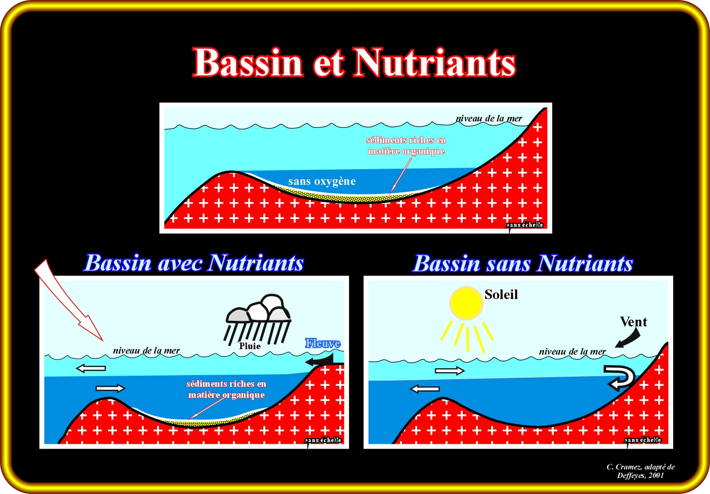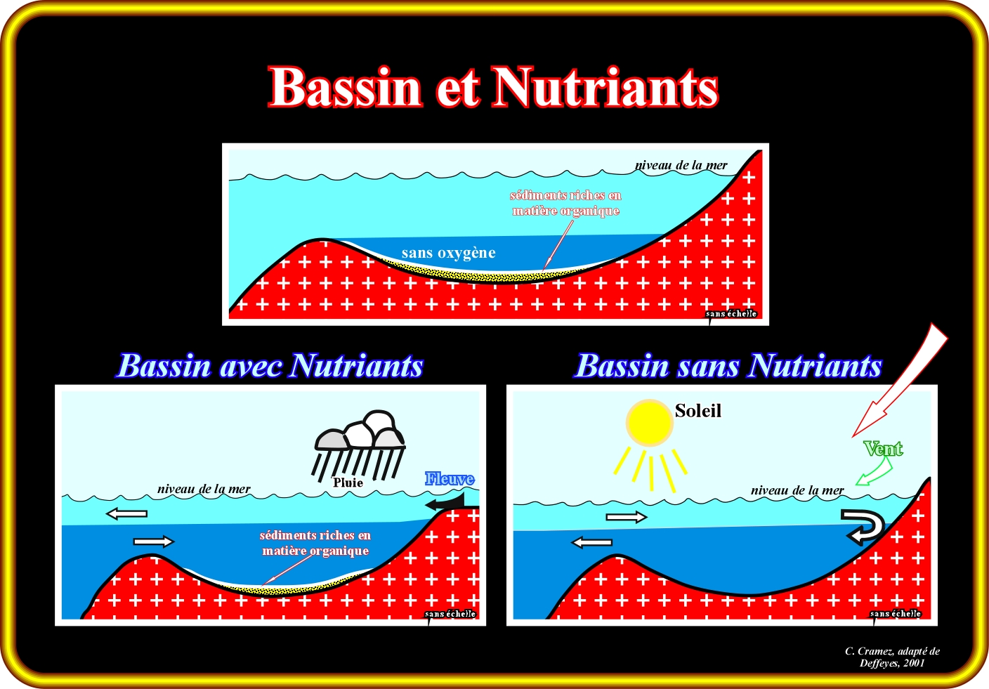 Bassin riche en nutriments. Lorsque l'eau d'un bassin océanique, plus ou moins, confiné est riche en nutriments. Les cadavres et matières fécales transfèrent les nutriants biologiques des d'eaux de surface pour les eaux profondes. La circulation de l'eau de mer dans un bassin, plus ou moins, confiné dépend de l'équilibre entre l'évaporation et l'apport d'eau douce. Lorsque l'évaporation excède l'apport (pluie, les rivières, etc.), l'eau profonde, riche en nutriants, est exportée, formant un bassin sans nutriants. Lorsque l'apport d'eau douce est plus élevé que l'eau perdue par évaporation, les nutriments biologiques sont conservés dans le bassin confiné (bassin avec nutriants), ce qui permettra la formation de roches sédimentaires riches en matière organique (roches-mères potentielles).