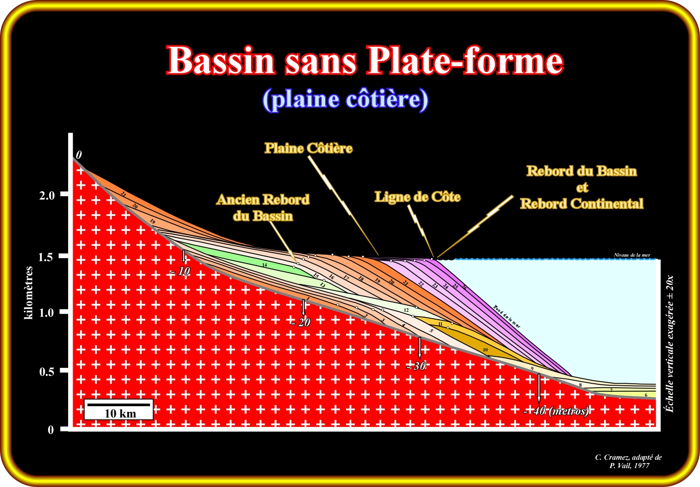 Dans ce modèle, il est évident que, pendant les intervalles stratigraphiques définis par les intervalles temps 18 - 21 et 22 - 27, le bassin n'a pas de plate-forme continentale. La ligne de côte (à peu près équivalente à la rupture côtière de l'inclinaison de la surface de déposition) coïncide avec le rebord continental (limite supérieure du talus continentale). En amont du rebord du bassin, se trouve la plaine côtière et la ligne de côte coïncide avec le bord continental (bassin sans plate-forme). Cette situation géologique est créée lors des cortèges sédimentaires régressives des cycles-séquence. Ainsi, lorsque du pic de transgression (limite supérieure du cortège transgressif), la ligne de côte est très éloignée (vers l'amont) du rebord du bassin, puisque l'extension de la plate-forme continentale est maximale. Lorsque le niveau de la mer commence à monter en décélération, c'est-à-dire, au début du prisme de haut niveau, le bassin a encore une plate-forme continentale. Cependant, peu à peu, au fur et à mesure que la ligne de côte prograde vers la mer, la distance entre la ligne de côte et le rebord du bassin diminue et l'extension de la plate-forme continentale aussi. Dès le moment que la ligne de côte fossilise le rebord continental, la plate-forme disparaît et la limite externe de la plaine côtière devient le nouveau rebord du bassin (et rebord continental). Dans ces conditions, une petite instabilité du nouveau rebord du bassin ou un excès d'apport sédimentaire (crue d'une rivière, par exemple) peut initier des courants de turbidité le long du talus continental. Lorsque ces courants atteignent la plaine abyssale, le matériel transporté est déposé sous la forme de cônes sous-marins de bassin et talus. Ainsi, les dépôts turbiditiques profonds ne sont pas, exclusivement, associés à des conditions géologiques de bas niveau marin, c'est-à-dire, associés avec des discordances (chutes relatives du niveau de la mer significatives).