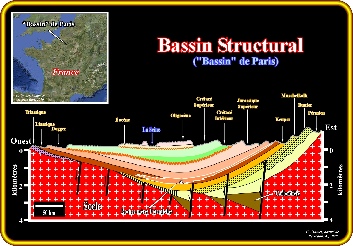Cette section géologique montre, grossièrement, la configuration structurale et stratigraphique de ce que beaucoup de géoscientistes appellent "le bassin" de Paris. Prenant en ligne de compte la définition de bassin sédimentaire (la zone affaissée de la croûte terrestre, à géométrie variable, de forme circulaire à linéaire, en général, d'origine tectonique, dans laquelle se peuvent déposer des sédiments qui s'épaississent toujours vers la partie profonde centrale la plus subsidante), cette coupe géologique suggère fortement que "le bassin" de Paris est un bassin structural, autrement dit, une plate-forme continentale soulevée à l'Est et Ouest, et non un bassin sédimentaire proprement dit. En fait, un bassin sédimentaire est une structure extensive de géométrie synforme (un synclinal est une structure compressive), plus ou moins circulaire, dans laquelle les couches s'épaississent, légèrement, vers le centre. Comme le montre cette coupe à l'exception des demi-grabens du Carbonifère, qui sont les bassins de type-rift sur lesquels s'est déposée la marge mésozoïque, l'épaisseur des intervalles stratigraphiques est, à peu près, constant (existent plusieurs discordances renforcées par la tectonique). Comme les sédiments inclinent vers le centre sans s'épaissir, cela signifie que la géométrie synforme est postérieure au dépôt et que, probablement, les sédiments se sont déposés dans un milieu de plate-forme ou plaine abyssale, puisque la configuration interne des intervalles est parallèle (plusieurs données réfutent la deuxième hypothèse). Le sous-système pétrolier générateur (roches-mères du Lias) est situé au le centre et à l'Est. Selon certains géoscientistes, l'évolution de la matière organique de ces roches-mères est dépendante de l'érosion associée aux discordances du Crétacé Tardif et Tertiaire. Ceci implique qu'avant l'érosion qui a produit les discordances, la matière organique des roches-mères avaient déjà atteint la maturation. Cependant, cette hypothèse n'a jamais été testée. Les relations géométriques observées sur les lignes sismiques et coupes géologiques semblent réfuter plutôt que corroborer cette hypothèse.