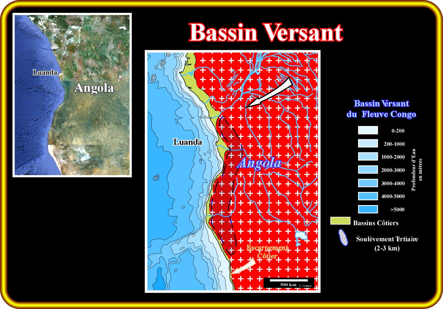 Le bassin versant du Congo, ici illustré, est contrôlé par l'escarpement côtier observé tout le long de la côte de l'Angola. Ce soulèvement, qui a eu lieu à la fin du Tertiaire est très bien visible sur les lignes conventionnelles sismiques (profondeur d'eau inférieure à 200 mètres) tirées au large de la côte. En réalité, le fond de la mer est caractérisé par des biseau sommitaux d'érosion, lesquels suggèrent un soulèvement maximale d'environ 1500-2000 mètres. Ce soulèvement est corroboré par la maturation de la matière organique des roches-mères des bassins de type-rift et de la base de la marge divergente (pouvoir réflecteur de la vitrinite), lesquelles se trouvent, parfois (Cabinda), à moins de 600 mètres profondeur. À l'exception des fleuves Kwanza (partie centrale de la carte) et Cunene (au sud de la carte), qui traversent le escarpement côtier par d'étroits canyons, tous les autres (rivières) s'écoulent vers l'intérieur du continent formant, en grande partie, le bassin versant du Congo, donc l'embouchure est au nord de l'escarpement de l'Angola. Cette morphologie explique, facilement, pourquoi les systèmes de dépôt turbiditiques (Oligocène et plus tardifs) sont fréquents dans l'offshore du Congo et Cabinda et, pratiquement, inexistants dans l'offshore angolais (sud d'Ambriz, c'est-à-dire dans le bassin offshore du Kwanza), ce qui a des répercussions sur les systèmes pétroliers. En fait, au point de vu pétrolier, tous les champs sont situés au nord de l'arc structural d'Ambriz (où le socle atteint la ligne de côte) qui limite le bassin sédimentaire du Congo (au nord) du bassin du Kwanza (au sud). Dans le bassin du Kwanza, sauf le petit champ de Quenguela (environ 40 Mb), situé à terre et dont le système pétrolier est très différent des systèmes conventionnels, tous les autres accumulations ont été considérées non-économiques, même pour un prix du baril à plus de $100 USA. Les raisons, les plus probables, sont le manque de roches-réservoir, tels que celles associées aux systèmes turbiditiques du Tertiaire Tardif du bassin du Congo et le fait que les roches-mères des bassins de type-rift type sont, ici, très peu prolifiques.