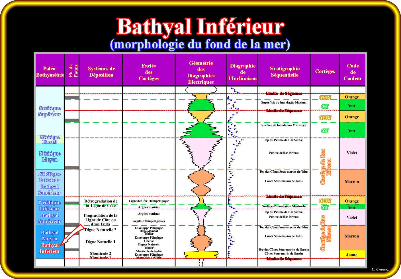 Le sous-environnement bathyal inférieur est la partie de l'environnement bathyal qui fait la liaison avec la plaine abyssale. Il est le domaine des premiers cônes sous-marins de talus, lesquels se déposent dès que le niveau relatif de la mer commence à monter. Les cônes sous-marins de bassin, au contraire, se déposent au cours des descentes relatives du niveau de la mer, de préférence dans la plaine abyssale. En fait, lorsque que les courants turbiditiques (ou de turbidité) entrent en décélération, dû à la rupture inférieur d'inclinaison du talus continental (limite talus-plaine abyssale), ils perdent compétence (de transport) et les sédiments commencent à se déposer. Ainsi, on peut dire, que le dépôt des cônes sous-marins de bassin (CSB) est synchrone de la surface d'érosion induite par la chute relative du niveau marin. En d'autres termes, l'âge des cônes sous-marins de bassin (CSB) donne l'âge de la discordance inférieure, autrement dit, du limite inférieur du cycle-séquence associé. Notons que lorsque les courants turbiditiques sont très compétentes, ce qui implique un grand volume de matériel transporté, les cônes sous-marins de bassin sont déconnectés de la rupture entre le talus et la plaine abyssale (se déposent plus loin). Ainsi, les cônes sous-marins de talus (CST) peuvent être déposés directement dans la plaine abyssale. Dans cette figure, est esquissée l'analyse séquentielle d'un puits d'exploration. Dans la première colonne sont marquées les environnements de dépôt. À la base ce cette colonne, on observe que les sédiments déposés dans le sous-environnement bathyal inférieur sont les cônes sous-marin de bassin et que dans le bathyal moyenne se déposent le tablier (base de dépôts de talus-apron) et les digues marginales naturelles des cônes sous-marin de talus, lesquels se déposent sur les cônes sous-marin de bassin. Dans le sous-environnement bathyal supérieur, les sédiments deltaïques sont, souvent, prépondérants. Dans les diagraphies électriques, les cônes sous-marins de talus ont une géométrie strato et granocroissante vers le haut, tandis que les cônes sous-marins de bassin ont une géométrie cylindrique. L'interface entre les cônes sous-marins de bassin et de talus correspond à un pic de faune, ce qui signifie que l'hiatus de non-dépôt entre les deux systèmes turbiditiques, a permis l'accumulation sur le fond de la mer, d'un grand nombre de restes et fragments d'animaux et végétaux.