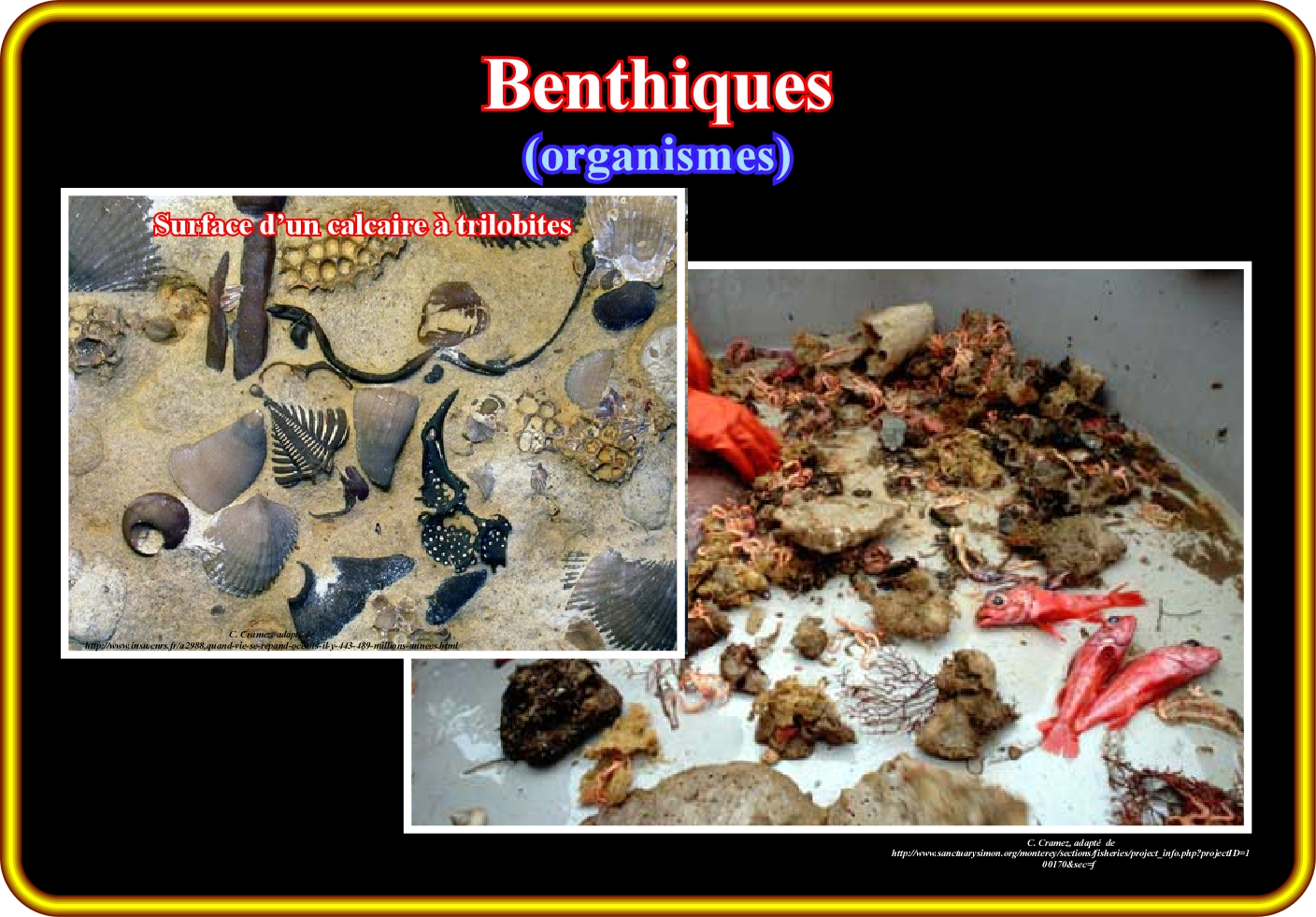 Depuis les années 70, les étudiants en écologie marine du "Moss Landing Marine Laboratories" ont participé à plusieurs croisières pour étudier les poissons et invertébrés des environnements profonds de la Baie de Monterey (EUA). La photo de droite (Griffiths), illustre un échantillonnage des organismes benthiques qu'ils ont étudié. Dans la recherche pétrolière, les benthiques les plus étudiés et plus utiles sont certainement les foraminifères. En fait, les foraminifères, qui se trouvent en tous les milieux marins, peuvent être planctoniques ou benthiques. Ils appartiennent à la ordre Foraminiferida (appelés de manière formelle foraminifères). Cette ordre fait partie du règne des Protistes, sous-règne Protozoa, phylum Sarcomastiphora, sous-phylum Sacrodina, super-classe Rhizopoda et classe Granuloreticulosea. Les foraminifères ont une coquille et sont des animaux unicellulaires dépourvus de tissus et organes, mais ont des granuloreticuloses (fibres d'ectoplasme qui ont beaucoup de grains et des particules fines de différents matériaux). Les foraminifères ont une distribution géologique très large (du Cambrien à nos jours). Les premières formes qui apparaissent dans les archives fossiles (Allogromina) ont des coquilles organiques ou des tubes agglutinés (coquilles formées par agglutination de particules étrangères liées par une grande variété de ciments). Les foraminifères avec carapaces dures sont rares jusqu'au Dévonien qui est la période géologique dans laquelle les fusulinídeos ont commencé à se développer et dont l'apogée s'est produit dans le Carbonifère et Permien, avant qu'ils disparaissent complètement à la fin du Paléozoïque. Les premières formes sont benthiques. Les formes planctoniques qui dérivent dans la partie supérieure des corps d'eau, apparaissent uniquement dans les archives fossiles du Jurassique Moyen (marge nord de la mer de Téthys et bassins épicontinentaux de l'Europe). Ils ont, probablement, été des formes méroplanctoniques, (seulement planctoniques durant les derniers stades de leur cycle de vie). La surface calcaire à gauche illustre un milieu benthique paléozoïque avec différents types d'organismes vivant sur le fond marin.