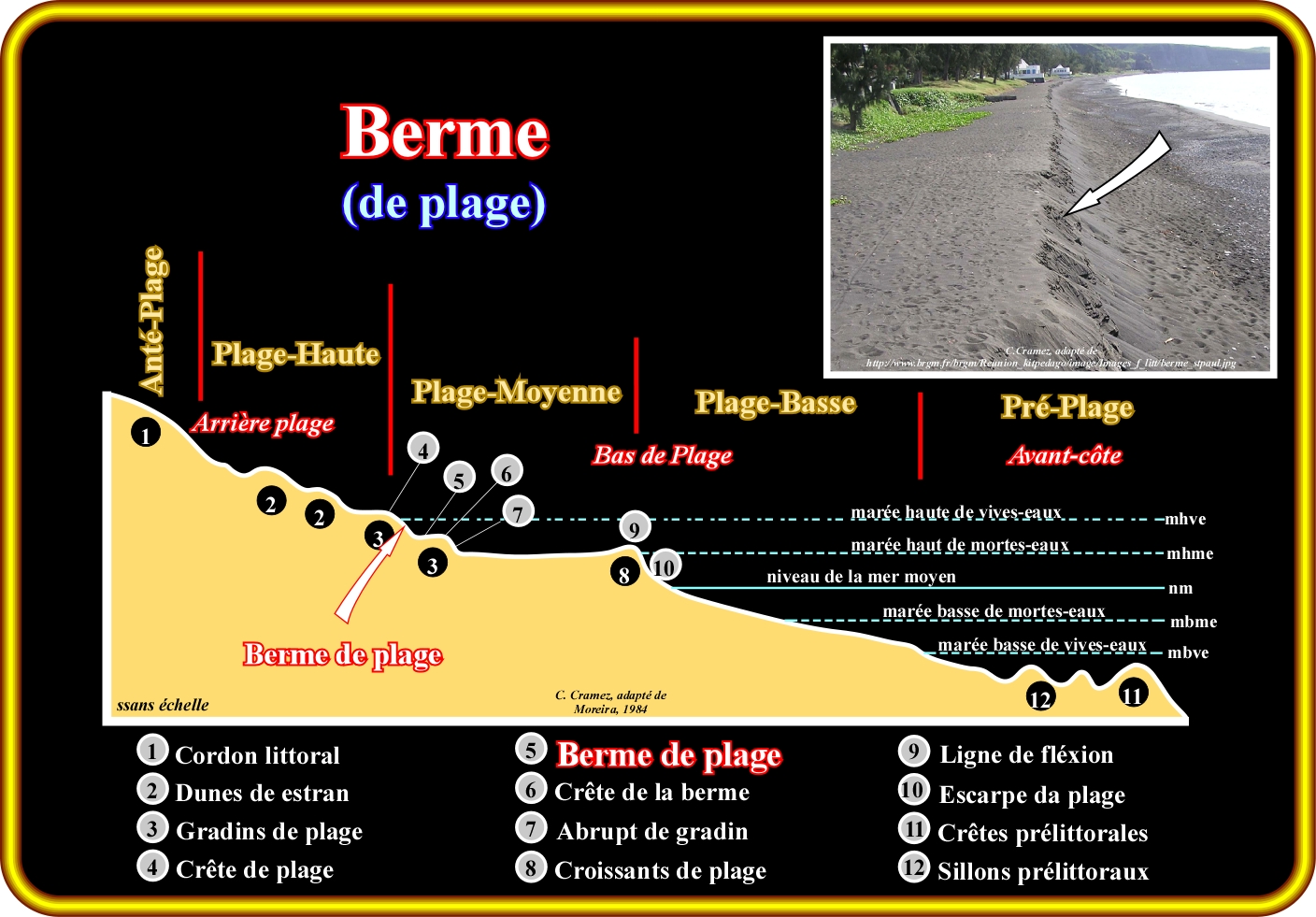 Corps sédimentaire sableux de plage situé sur la zone supérieure de battement de la houle. Créé lors des périodes d’engraissement de plage par des houles calmes et régulières. Plusieurs bermes peuvent se succéder sur un profil de plage.
