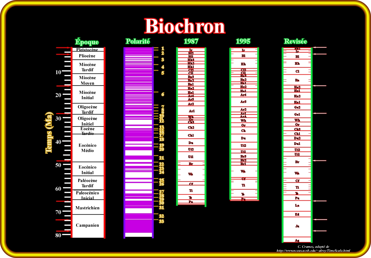 Dans l'échelle des temps géologiques, basée sur les mammifères d'Amérique du Nord, les colonnes Époque et Polarité correspondent correspondent aux chrons des époques globales marines et polarité magnétique (Berggren et al., 1995). Les numéros des chronos sont indiqués à côté de la colonne de polarité. "1987" "1995" et "révisée"correspondent aux échelles temps de Woodburne (1987) et Woodburne et Swisher (1995). Les limites équivalentes sont indiquées par des lignes pointillés. Les noms complets des biochrons des mammifères sont donnés dans la publication originale. Les flèches indiquent les âges estimés, utilisés comme des points d'interpolation dans la calibration des données. N'oublions pas que le taxon (singulier de taxa) ou unité taxonomique est le nom que désigne un organisme ou un groupe d'organismes. Dans la nomenclature biologique proposée par Linné (XVIIe siècle), à un taxon est assigné un ordre taxonomique et, peut être, placé à un niveau particulier de la hiérarchie systématique évolutives. Une distinction importante doit être faite entre : (i) Taxa-Taxonomie (science qui traite de la classification des êtres vivants, utilisant un système uniforme qui exprime, de la forme, plus ou moins, fidèle, le degré de similitude entre eux) et (ii) Classification-Systématique. La première se réfère aux noms biologiques et aux règles de dénomination, tandis que la seconde se réfère à la position dans l'ordre de taxa d'accord avec les relations évolutives (phylogénétiques). Comme les données biostratigraphiques sont, souvent, compliquées dû au fait que la distribution et variation des espèces est controversée d'un endroit à l'autre, certains géoscientistes, utilisent des logiciels, tels que le BioGraph du professeur Jean Guex (Université de Lausanne), qui optimise les coexistences virtuelles des espèces et produit des cartes de distribution, dans lesquelles les relations stratigraphiques conflictuelles sont exprimés comme co-occurrences virtuelles.