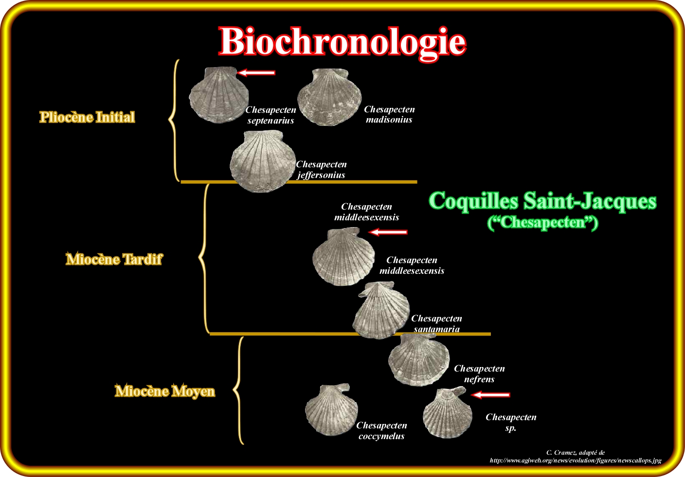 Dans cette figure est reconstruite la biochronologie du Miocène Moyen - Pliocène Initial, faite à partir de l'évolution des coquilles Saint-Jacques, c'est-à-dire, entre le Chesapecten nefrens (Miocène moyen) et Chesapecten septenarius (Pliocène Initial). Le problème entre la biochronologie et les limites biochrons a été analysé par M. Palombo et R. Sardella (2006), utilisant les faunes de grands mammifères du Pléistocène d'Italie. Les résultats de cette étude sont que la reconstruction de la biostratigraphie du Néogène-Quaternaire, dans les milieux continentaux et la reconnaissance des limites entre les successives faunes de mammifères, est un exercice très difficile. La définition et l'application de la biochronologie est, souvent, tachée par des références et inférences à partir biostratigraphie. Les discontinuités dans le registre sédimentaire continental, les conditions environnementales, les défauts taphonomiques (étude des processus post-mortem des animaux) et l'échantillonnage sont responsables du fait que l'ordre stratigraphique des restes de petites et grandes occurrences de fossiles ne reflète pas, nécessairement, l'ordre temporel des vrais apparitions des premières et dernières apparitions des taxa (événements paléobiologiques) dans le temps. L'émergence du premier / dernier bio-événement (enregistré dans les petites et grandes occurrences de restes fossiles dans les niveaux fossilifères des différents séquences stratigraphiques continentales) a été la principale base de l'établissement des contextes biochronológiques continentaux de la faune des mammifères. Par conséquent, du point de vue théorique, «les limites» doivent être définis par les plus anciens et / ou plus jeunes «événements historiques" d'un ou plusieurs taxa. Utilisant des exemples de la faune (mammifères) trouvés en Italie et en particulier, ceux de la transition du Villefranchien au Galérien et du Galérien au Aurélien, les auteurs, à partir des résultats obtenus ont souligné, une fois de plus) la difficulté de définir un schéma stable, qui peuvent être utilisé comme base de corrélation par communauté scientifique internationale.