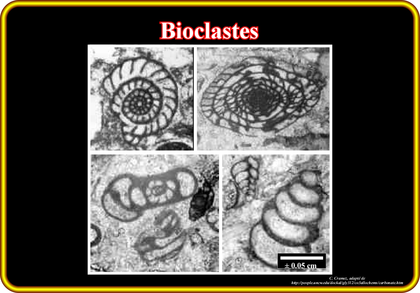 Sécrétion de calcite et aragonite des plantes et animaux de toutes sortes, à l'exclusion des restes fossiles non-carbonatés. Différents organismes produisent des squelettes différents avec des structures diverses. Chaque type d'organisme a des caractéristiques qui permettent une identification, relativement, facile surtout, dans les lames minces.
