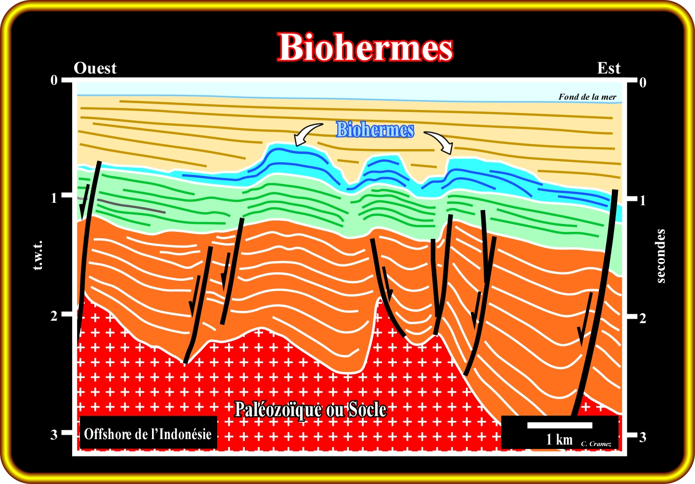 Dans cette tentative d'interprétation géologique d'une ligne sismique de l'offshore de l'Indonésie, des structures monticulaires, probablement, des biohermes (ne pas confondre avec des biostromes, qui sont des corps stratifiés formés par l'accumulation d'organismes constructeurs ayant subi une faible transport) sont clairement visibles dans la partie supérieur du bassin d'arrière-arc. Tenant compte du contexte géologique global de cette zone, situé dans le mégasuture Méso-Cénozoïque, sur les lignes sismiques on peut reconnaître, de bas en haut, trois types de bassins de la classification proposée par Bally et Snelson (1980) : (i) Un socle ou substratum (ancienne chaîne plissée du Paléozoïque) ; (ii) Un bassin d'arrière-arc, dans lequel se distinguent les demi-grabens de la phase de rifting (subsidence différentielle) et les sédiments cratoniques de la phase affaissement thermique ("sag") et (iii) La marge divergente du type non-Atlantique (marge divergence développée dans un contexte globalement compressif, dû à la rupture de la lithosphère derrière l'arc volcanique et l'ouverture d'une mer marginale). La phase de rifting est reconnaissable par l'épaississement des sédiments contre les failles normales qui ont élargi la région en arrière l'arc (subsidence différentielle). La phase d'affaissement thermique, est reconnue par la configuration parallèle des réflecteurs et la marge non-Atlantique par la configuration progradante de ses réflecteurs. Les biohermes se sont développés au cours de subsidence thermique, lors de l'épisode transgressif, dans lequel l'augmentation de l'accommodation a été induite par des montées relatives successives du niveau de la mer. Cependant, le taux des montées relatives du a permis la croissance d'organismes carbonatés, ce qui signifie que la profondeur de l'eau est restée, plus ou moins, constante. Ces anomalies carbonatées, qui sont fossilisés par des biseaux de progradation de la marge divergente, sont des excellentes roches-réservoir. Malheureusement, elles sont saturées, principalement, par du CO_2 (68%). Toutefois, les réserves totales (CO_2 + CH_4) sont à l'ordre de 150 Tcf.
