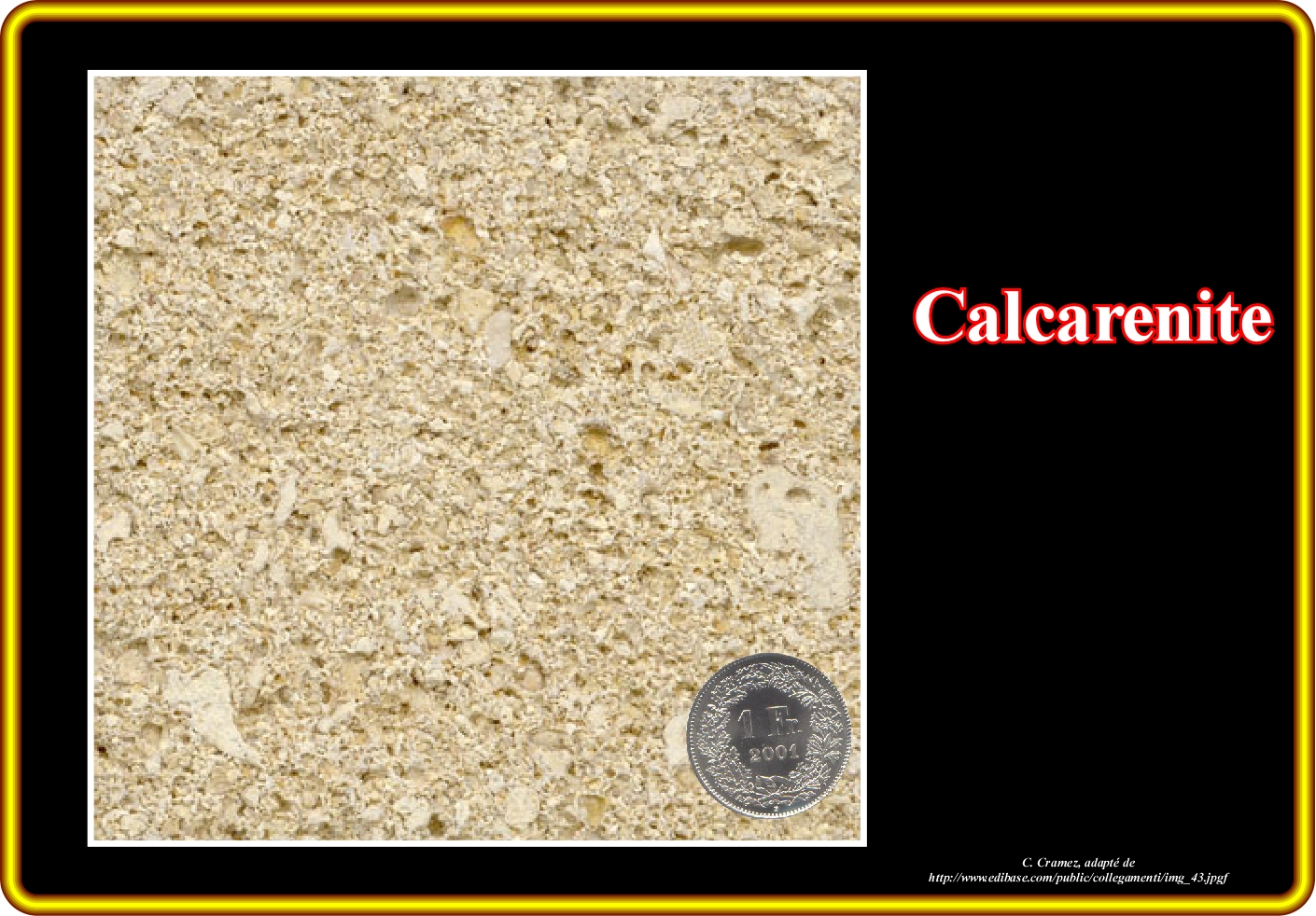 Les calcarénites sont des grès formés par consolidation de sables calcaires. Ils se forment, principalement, dans les zones côtières des régions tropicales, en association avec des dunes massives de sable formées par érosion de récifs coralliens. Les dunes se développent dans les zones où le sable (calcaire) est abondant et non fixé par la végétation. Le sable est érodé et transporté par le vent (déflation), à proximité du sol, et par saltation, pour s'accumuler quand la compétence du vent diminue (versant de la dune protégé du vent). Une dune peut se déplacer par érosion du versant exposé au vent et accumulation sur le versant opposé. C'est la diagénèse (processus chimiques et mécaniques qui affectent un dépôt après sa formation), qui transforme les sables calcaires en calcarénites. Dans ce type de transformation, il y a deux étapes : (i) Enfouissement et compaction des grains, lesquels sont détritus minéraux, qui résultant de la désagrégation des roches ou débris organiques, (restes de plantes et d'animaux) ; ce processus se produit au fur et à mesure que d'autres sédiments viennent couvrir le dépôt pour le placer, peu à peu, à plusieurs dizaines ou même des milliers de mètres de profondeur et (ii) Cimentation des grains. La cimentation est un processus chimique simple, dans lequel l'eau qui circule entre les grains, devenant saturée en certains minéraux, les précipite dans les pores entre les grains terminant pour consolider les particules de sable. Un calcarénite s'identifie non seulement par effervescence au contact avec l'acide chlorhydrique (HCl), mais aussi par sa rugosité. Comme illustré ci-dessus, en général, sa couleur est rose ou gris. Un calcarénite appartient à la famille des calcilutites (boues calcaires cimentées et consolidées), calcirudites (restes grossiers d'organismes cimentés et consolidés), craies (calcaires blancs formés par l'accumulation de squelettes de coccolithes d'organismes unicellulaires), calcaires à entroques (accumulations de débris des crinoïdes, qui sont une variété d'échinodermes) et travertins (calcaires formés dans les sources émergentes riches en CO_3Ca dissous).
