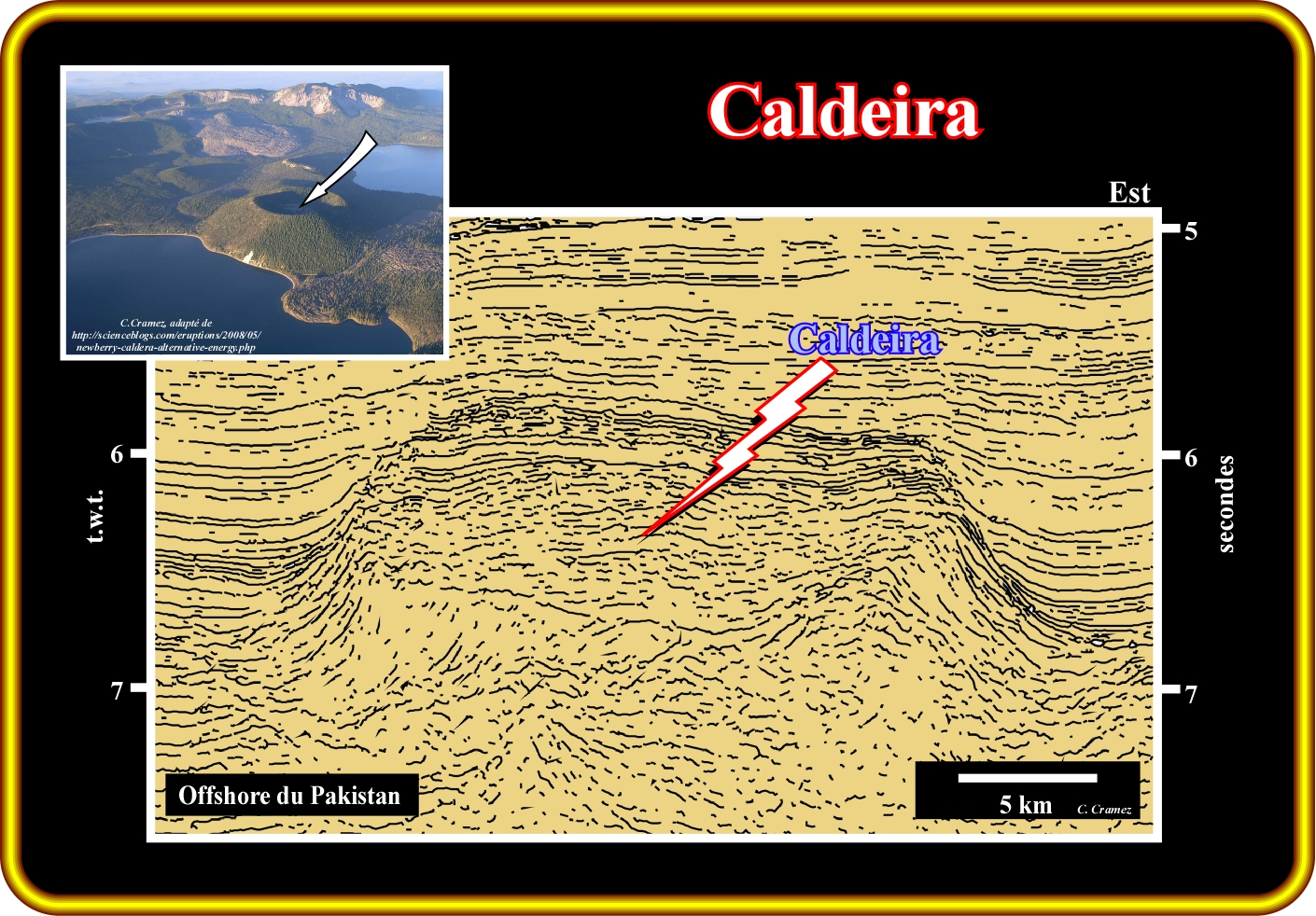 Cette structure peut être interprétée comme une caldeira qui a été remplie par du matériel volcanique, en association avec un centre d'expansion subaérien. Les réflecteurs sismiques représentés dans cette interprétation (ne pas confondre avec la ligne sismique originale) suggèrent que dans l'offshore profond du Pakistan (marge continentale type-Atlantique), le substrat des cônes sous-marins de talus, associée aux fleuves Ganges et Brahmapoutre, est constitué par des roches volcaniques subaériennes. Cette hypothèse a été corroborée par des puits d'exploration pétrolière, lesquels, ont, également, corroboré le modèle géologique de formation des marges divergentes type-Atlantique proposé par les géoscientistes de Total SA, lequel peut être résumé comme ceci : (i) Dès qu'un supercontinent se forme, par l'agglutination de plusieurs continents, dans son intérieur, se développent les anomalies thermiques qui provoquent un allongement de la lithosphère (essentiellement de la croûte continentale) ; (ii) L'allongement produit des structures de type "graben" (généralement, des hémi-grabens), puisque les sédiments ne peuvent qu'être allongés par des failles normales ; (iii) L'allongement, cause ou effet, induit un amincissement de la lithosphère ; (iv) Au fur et à mesure que la lithosphère s'amincit, elle est fortement injectée par dykes volcaniques ; (v) À partir d'un certain taux d'allongement, l'épaisseur de la lithosphère se réduit considérablement (10-20 km) et ne peut plus s'allonger par des failles normales ; (vi) La lithosphère se casse en différentes plaques lithosphériques (rupture continentale), le long des fissures irrégulières, dès que le matériel volcanique intrusif devient prépondérant sur le matériel crustal initial ; (vii) A partir de cette moment, quand le matériau volcanique atteint la surface, il s'écoule dans des directions opposées sur la croûte continental (laves subaériennes) ; (viii) La poursuite de ce processus oblige les centres d'expansion (volcans) à immerger, ce qui induit la formation de croûte océanique (laves en coussin), une fois que le matériel volcanique ne peut pas s'écouler sous l'eau.