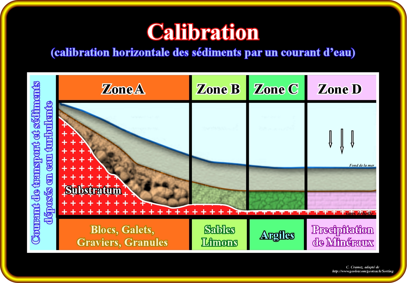 Ce schéma établit la corrélation entre les zones de dépôt et les sédiments clastiques associés à un étalonnage réalisé par un courant d'eau. Dans la zone A, la plus proche de la source des sédiments, prédominent des blocs, galets, gravier et grève. Dans la zone B, qui se trouve habituellement à la base des talus (continental ou non), les sables et limon sont prédominants. Dans la zone C, située dans les parties profondes des bassins sédimentaires proches du continent, les sédiments sont, principalement, argileux. Dans la zone D, que se situe dans les parties les plus profondes des bassins sédimentaires (et les plus éloignées du continent), la grande majorité des particules se déposent par précipitations et non par transport. Cette séquence de particules, au fur et à mesure, que la compétence de transport du courant diminue, s'observe très bien dans les systèmes de déposition turbiditique. En fait, dans une couche turbiditique, il y a une stratification granodécroissante vers haut qui traduit, la calibration des sédiments illustrée sur cette figure. Pour comprendre la signification géologique des roches sédimentaires, n'oublions pas que tous les processus sédimentaires qu'ils soient la météorisation, transport ou dépôt, travaillent pour un objectif commun qui est celui d'obtenir une calibrage des trois produits finaux de tous les processus sédimentaires, c'est-à-dire, du quartz (sable), argile (ardoises) et calcaire. Il est conseillé de ne pas utiliser le nom d'un minéral pour désigner une roche. Le terme argile, par exemple, désigne, essentiellement, un minéral très fin formée par l'altération d'un feldspath. C'est l'argile que salie les chaussures et c'est, également, l'argile qui rend boueuse l'eau d'une rivière ou d'un lac. Cependant, quand elle se dépose et se compacte, elle devient une roche qu'on doit appeler ardoise ou schiste, mais non argile. Il y a deux types de sédiments : (i) Clastiques et (i) Précipités. Les premiers sont formés par la désintégration de roches, et les secondes par précipitation de solutions organiques ou inorganiques.