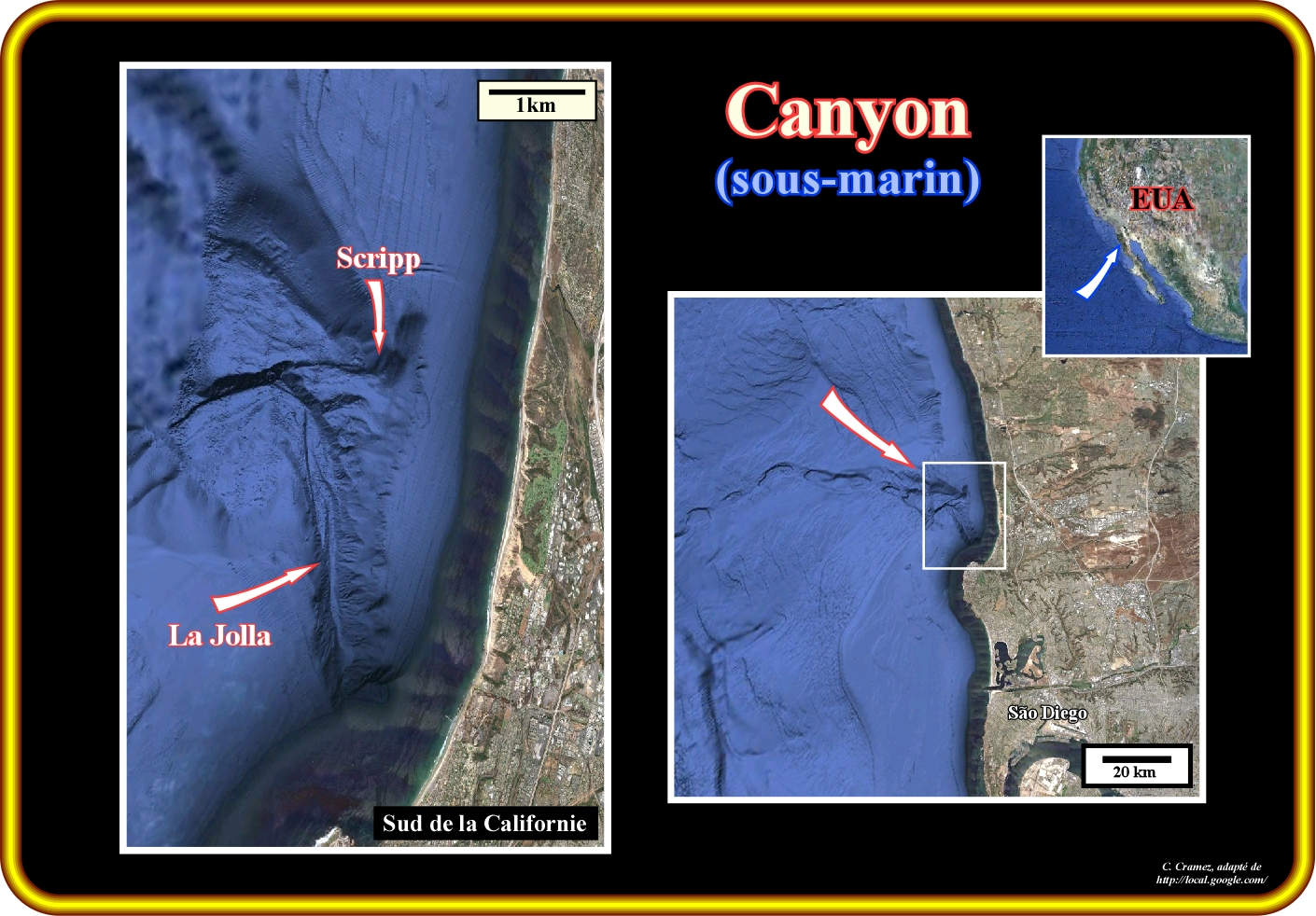 Ces images illustrent deux canyons sous-marins de l'offshore de la Californie (USA) : (i) La Jolla et (ii) Scripps. Le canyon de La Jolla (nord de la ville de San Diego) est plus large que le canyon de Scripps. Le canyon de Scripps qui est bien illustré dans les deux figures, est, dans sa partie supérieure, composée de trois branches qui ont creusé profondément les boues carbonatées et sables de l’Éocène, qui forment le fond de la mer au nord de San Diego. En général, les canyons se forment, de préférence, sur la partie supérieure du talus continental, près du rebord continental (ou rebord du bassin, quand celui-ci a une plate-forme), où l'action érosive associée aux chutes relatives du niveau de la mer a, encore, une importance significative. Quand en amont d'un canyon sous-marin il y a un grand fleuve, comme c'est le cas, par exemple, dans l'offshore du Congo (du canyon du Congo et du fleuve Congo), il est très probable que le canyon ait été initié par l'action érosive du fleuve lors d'une chute relative du niveau de la mer. Effectivement, quand le niveau relatif de la mer descend, considérablement, et devient plus bas que le rebord continental, l'ancienne plate-forme continentale (profondeur d'eau entre 0 et 200 m) est exhumée et se transforme dans une plaine côtière. La ligne de côte se déplace vers l'aval, parfois plus d'une centaine de kilomètres, et le profil d'équilibre provisoire des fleuves est rompu (le profil d'équilibre n'est jamais atteint). Ainsi, les fleuves sont contraints de creuser leurs lits pour atteindre un nouveau profil d'équilibre provisoire. C'est cette incision qui, souvent, initie la formation d'un canyon, en aval du rebord continental, laquelle, ensuite, évolue de différentes manières, selon les changements relatifs du niveau de la mer et l'importance l'apport terrigène. Certains canyons, sur le talus continental, se forment indépendamment des fleuves, en association avec les courants marines ascendants.