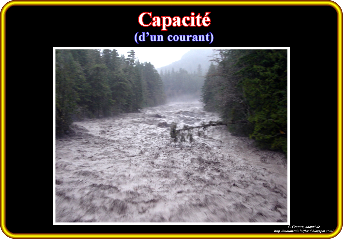 La capacité d'un courant correspond, pratiquement, au gradient du courant, c'est-à-dire, au taux de changement du courant par unité de distance (cm ou m par km). Les sédiments peuvent être transportés par un courant de trois manières différentes : (i) Roulement - Saltation (ii) Dissolution et (iii) Suspension. Dans le premier cas, les sédiments (cailloux, blocs, sable, etc.) se déplacement sur le lit du courant. Toutefois, ils peuvent se déplacer soit par traction (roulement continu) ou saltation (sauts). La saltation, qui est commun pour les particules plus grosses, facilite le déplacement d'autres particules dans le lit du courant. En fait, les particules sont transportés en suspension, pendant courtes distances, et retombent dans le lit, délogeant, éventuellement, les particules déposées sur le lit. Naturellement, le transport par dissolution est invisible. La matière est transportée sous la forme d'ions. Tous les courants transportent une quantité, plus ou moins, importante de matériel dissous qui résulte de l'érosion chimique des minéraux ou de la contamination des eaux souterraines minéralisées. C'est par dissolution que sont transportés les sédiments le plus fins. Le transport par suspension englobe tous les sédiments fins qui ne peuvent être transportés par dissolution et qui sont trop fins pour rester sur lit du courant. L'écoulement normal d'un courant conserve facilement les particules fines en suspension comme le limon, argile et silte. Le matériel transporté en suspension résulte de l'érosion hydraulique dans les bords et lits des courants. Quantitativement, le matériel transporté en suspension représente la majeure partie du matériel qui transporte un courant. Notons qu'un courant est tout le cours d'eau que canalise un écoulement et que la ligne moyenne où les deux côtés de la vallée s'interceptent est le thalweg. Plus le talweg est incliné plus grand est la capacité du courant.