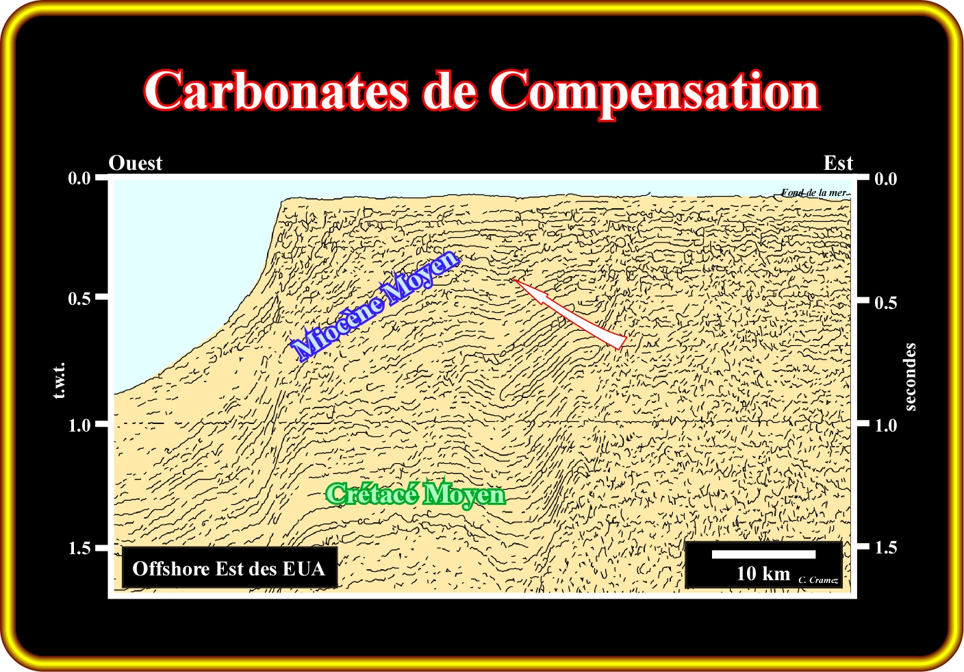 Dans cette ligne sismique (les réflecteurs sont soulignés par des traits de crayon) de l'offshore de la Floride (USA), la plate-forme carbonatée postérieur au Miocène Moyen est composée par des carbonates de compensation déposés durant des montées relatives du niveau de la mer continues et lentes. De cette façon, l'espace disponible pour les sédiments (accommodation) créé, par l'action conjointe de l'eustasie et tectonique (subsidence ou soulèvement), est entièrement rempli par du matériel carbonaté récemment formé. Ces conditions permettent l'aggradation (augmentation d'épaisseur) et progradation (déplacement vers la mer) de la plate-forme. En effet, dans cette région, comme suggéré par les données sismiques, pendant le Néogène Supérieur, le taux d'accommodation était compensé par le taux de déposition. Ce type de carbonates contraste avec les carbonates dits de récupération, lesquels sont associés à une montée relative du niveau de la mer rapide suivie d'une montée relative lente. Après la montée relative du niveau de la mer initiale (rapide), l'accumulation de carbonate diminue (l'augmentation de la profondeur l'eau stagne) sans que pour autant la formation des carbonates cesse. Comme le taux de montée relative du niveau de la mer diminue, la plate-forme carbonatée se construit efficacement (verticalement). Si le taux d'accumulation est supérieur au taux de montée relative du niveau de la mer, la formation de carbonate deviendra de plus en plus efficace. Avec la poursuite de ce processus, l'accumulation dans la plate-forme de carbonate "récupérera" l'augmentation initiale rapide de la profondeur d'eau jusqu'à que la profondeur de production de carbonate maximale soit rétablie. Dans ces conditions de taux de production et d'accumulation élevés, l'accommodation peut devenir insuffisante et de cette façon la progradation latéral (vers l'aval) de la plate-forme devient impérative.