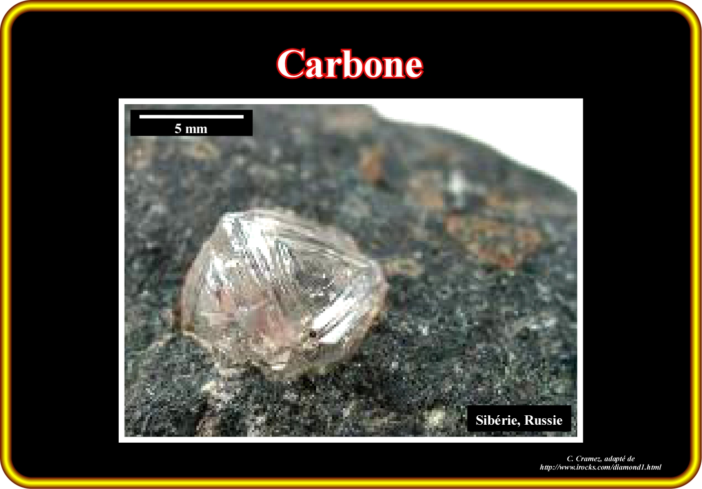 Le diamant illustré dans cette figure a environ 1.5 carats (un carat correspond à 200 mg) et est ancrée dans une éclogite (roche métamorphique, granuleuse, de composition basaltique, très dense qui résiste à des pressions très élevées) de la mine Udachnaya (Sibérie). Le diamant qui est une forme allotropique du carbone est le matériau naturel le plus dur connu. Sa dureté combinée au fort pouvoir dispersif de la lumière, le rend très utile non seulement dans l'industrie, mais aussi dans la bijouterie. Toutes les formes de carbone sont stables. Le carbone nécessite une température très élevée pour réagir avec d'autres éléments, même avec l'oxygène. Le degré d'oxydation du carbone plus commun dans les composés inorganiques est +4, alors qu'il est de +2 dans le monoxyde de carbone (CO). Les principales sources de carbone inorganique sont les calcaires, dolomies et dioxyde de carbone (CO_2). Des quantités importantes de carbone existent également dans les gisements de charbon, tourbe, pétrole et hydrates de méthane. Le carbone forme beaucoup plus de composés (matériel formé par plus d'un élément chimique) que tout autre élément. À ce jour, ont été décrits plus de 10 millions de composés, ce qui, théoriquement, correspond à une infime fraction de combinaisons possibles, en conditions de température et pression normales. En termes de masse, le carbone est le quatrième élément le plus abondant dans l'univers, après l'hydrogène, l'hélium et d'oxygène. Il est présent dans toutes les formes de vie. Dans le corps humain, en termes de masse, il est le deuxième élément le plus important (18%) après l'oxygène. Cette abondance, avec la diversité des composants organiques et la capacité qu'il a à former des polymères à des températures normales (sur la Terre), fait de cet élément chimique la base de toutes les formes de vie connues. Il y a trois isotopes naturels du carbone. Le 12C et 13C sont stables, tandis que le 14C est radioactif. Le 14C se forme dans les hauts niveaux de la troposphère et stratosphère, à une altitude comprise entre 9 et 15 km, par une réaction induite par les rayons cosmiques.