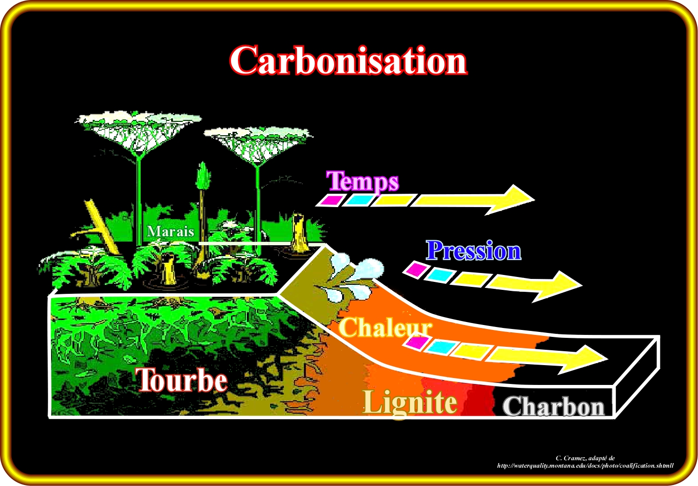 Augmentation de la teneur en carbone et pouvoir calorifique, ainsi qu'une diminution de la teneur en humidité des matières volatiles et de l'oxygène de la matière carbonée, quand celle-ci se transforme en lignite, tourbe, charbon bitumineux et, finalement, en anthracite.