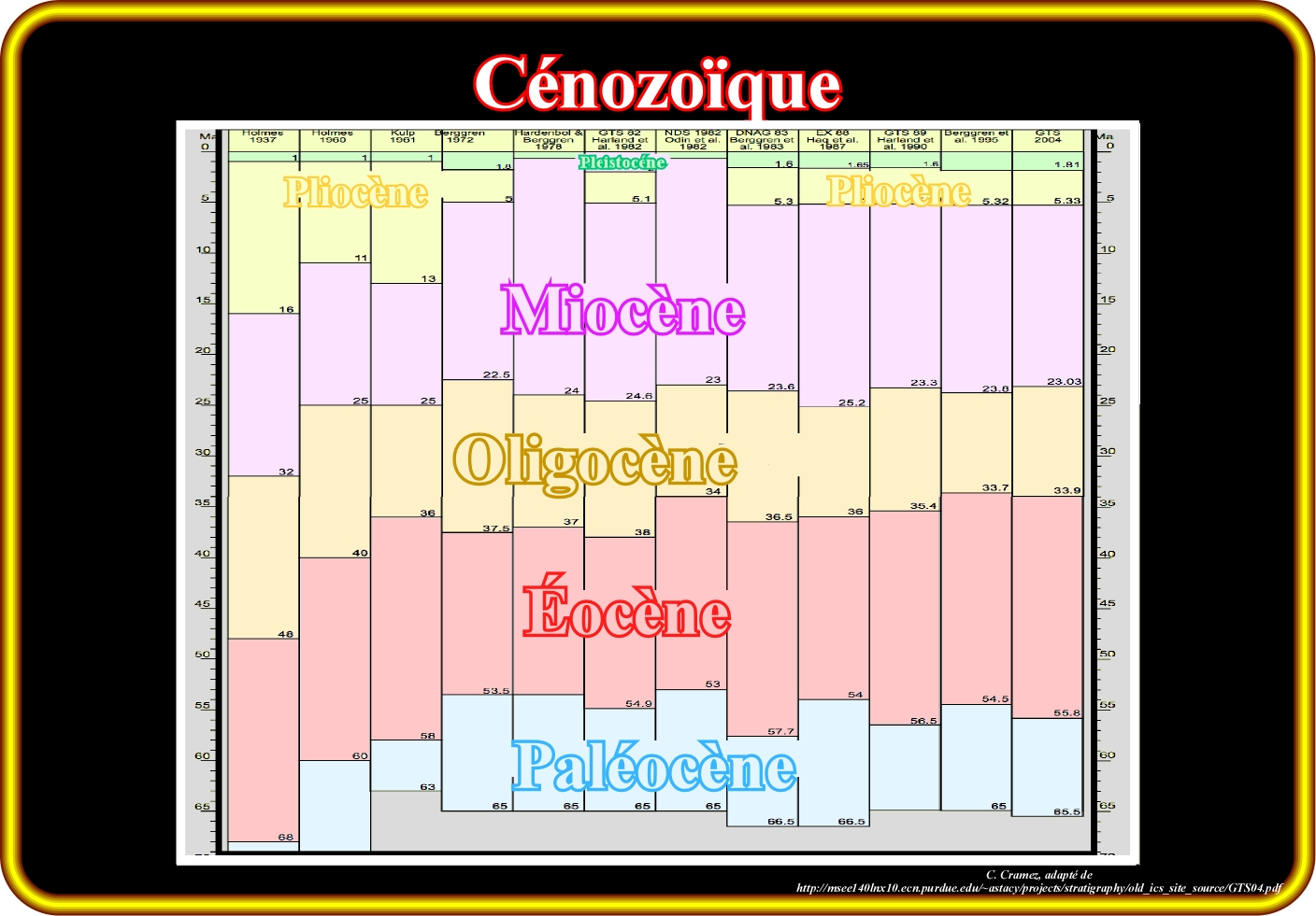 Dans ce schéma, à l'exception de l'Holocène (entre 0 et 10 ka) sont représentées les différentes périodes qui forment le Cénozoïque. Cependant, comme on le voit, les limites entre ces différents périodes varient selon les géoscientistes (de droite à gauche: a) Holmes, 1937 ; b) Holmes, 1960 ; c) Kulp, 1961 ; d) Berggren, 1972 ; e) Hardenbol & Berggren, 1978 ; f) 82 GTS (Harland et al, 1982) ; g) NDS 82 (Odin et al, 1982) ; h) DNAG 83 (Berggren et al, 1983) ; i) Exxon 88 ( Haq et al, 1987) ; j) 89 GTS (Harland et al, 1990) ; k) Berggren et al. El 1995) 2004 GTS. Pendant le Cénozoïque, la fragmentation et migration des continent, issus de la rupture du supercontinent Pangée, a continué et, peu à peu, la surface de la Terre a pris sa configuration actuelle. Deux processus géologiques de base sont responsables des principaux événements survenus au cours du Cénozoïque : (i) Collision continentale ou tectonique et (ii) Expansion océanique. Les quatre grands fragments continentaux issus du Gondwana se sont déplacé vers le nord et ont entré en collision avec la Laurasia. Parmi ces collisions, dont le point culminant est le Miocène Initial, se sont formé des grandes chaînes de montagnes. L'expansion de l'océan Atlantique Nord et Sud ont continué, contribuant à la déformation de la marge orientale africaine et des marges occidentales de l'Amérique du Nord et Sud, au fur et à mesure, que les continents étaient poussés contre les plaques tectoniques adjacentes. Les fragments continentaux résultant de la fragmentation du Gondwana sont l'Amérique du Sud, Afrique, Inde et Australie. L'Amérique du Sud n'a pas été poussé suffisamment vers le Nord pour provoquer une collision majeure avec l'Amérique du Nord. L'impact entre l'Afrique (qui continue à se déplacer vers le Nord) et l'Europe a été relativement faible. Les micro-plaques méditerranéens ont plusieurs fois été arrangés et comprimés, au fur et à mesure, que l'Afrique s'est déplacée vers le Nord. Les tentatives de la plaque africaine de plonger sous la plaque européenne, pour créer une zone de subduction, ont produit des raccourcissements significatifs dans la plaque européenne y compris les Alpes. La fermeture de la Téthys (aujourd'hui réduit à petits corps d'eau tels que la mer Méditerranée et Mer Noir) sont de bons exemples.