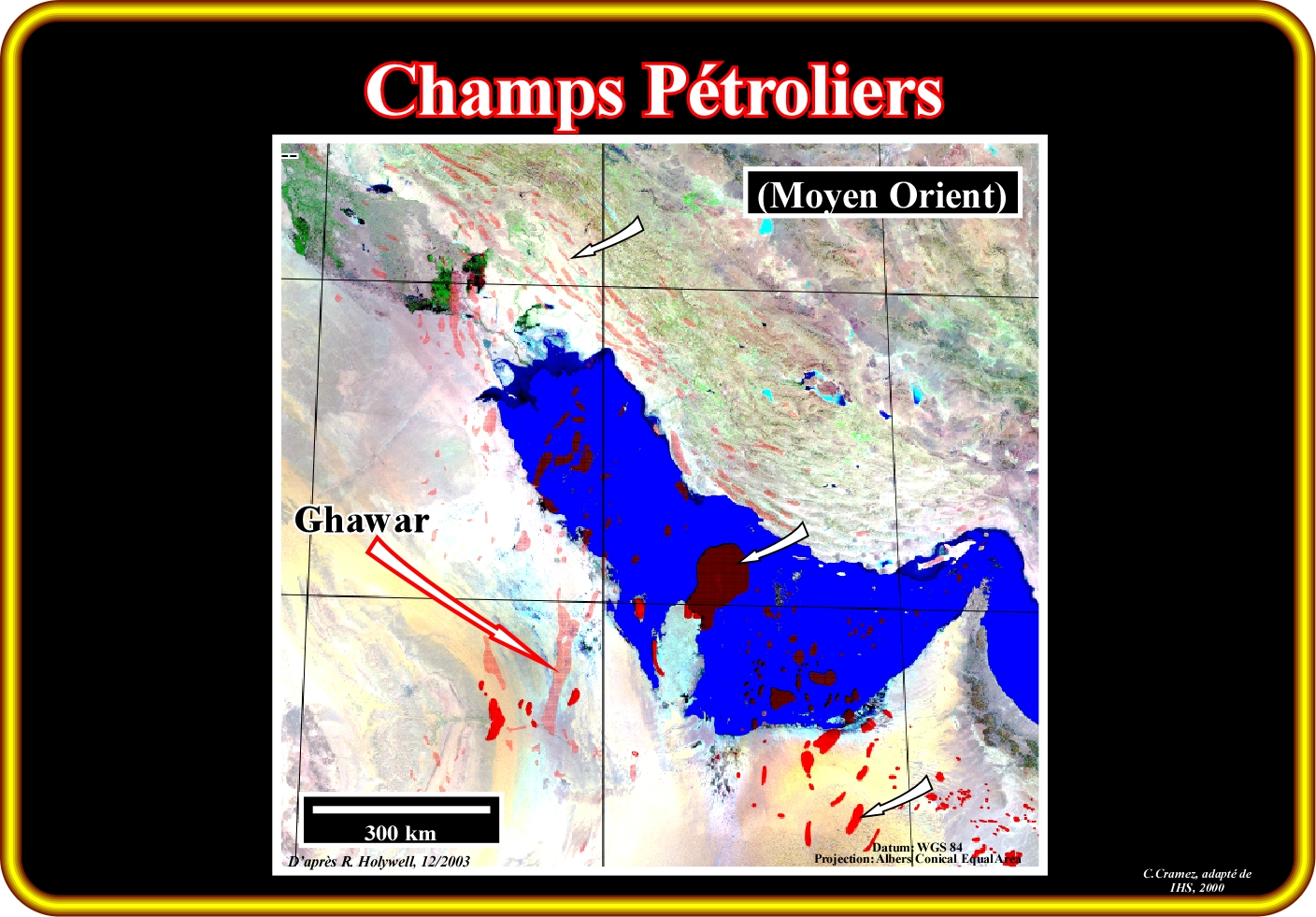 Dans cette photo, sont marqués (pour taches rouges) les champs pétrolifères les plus importants du Moyen-Orient. À titre d'exemple, notons l'emplacement du plus grand champ pétrolier du monde, autrement dit, Ghawar qui est situé dans le bassin d'avant-pays de l'Arabie Saoudite. Géologiquement, certaines régions sont extrêmement riches en hydrocarbures, tandis que d'autres (la plupart) sont très pauvres ou n'ont presque pas d'hydrocarbures. Une telle distribution apparaît injuste. Cependant, elle est le résultat d'une importante loi de la nature, c'est-à-dire, la loi de l'inégalité. Dans le cas d'accumulations d'huile, cette loi, est le résultat de la formation des systèmes naturels (systèmes pétroliers). En effet, la probabilité de formation d'un champ pétrolier dépend de l'existence de divers paramètres géologiques : (i) Roche-mère ou sous-système pétrolier générateur ; (ii) Roche-réservoir (sous-système pétrolier réservoir-piège ; (iii) Piège (sous-système de réservoir-piège); (iv) Migration (temps de formation du sous-système pétrolier générateur) et (v) Rétention (sous-système pétrolier réservoir-piège). Naturellement, si un de ces paramètres n'existe pas (zéro), la probabilité d'occurrence d'hydrocarbures économiquement rentables est zéro. On peut dire que la probabilité d'un champ pétrolier est la probabilité de l'existence du paramètre pétrolier le moins favorable. En termes mathématiques, la probabilité de formation d'un champ pétrolier est le produit des probabilités d'occurrence des différents paramètres. A posteriori, puisque la grande majorité des champs de pétrole a, déjà, été trouvé (plus de 95% des réserves ont été découvertes et tous les bassins pétrolières connues aujourd'hui l'étaient déjà dans les années 50), on peut dire que la probabilité de trouver un champ pétrolier, forant (au hasard) des puits d'exploration dans un bassin sédimentaire avec des exsudation d'huile, est de 4 - 5%. Ceci montre que la moderne et coûteux technologie utilisée actuellement, à savoir, la sismique 2D et 3D ont contribué uniquement à augmenter de 5 à 10-15% la probabilité de la découverte (ce qui est très significatif).