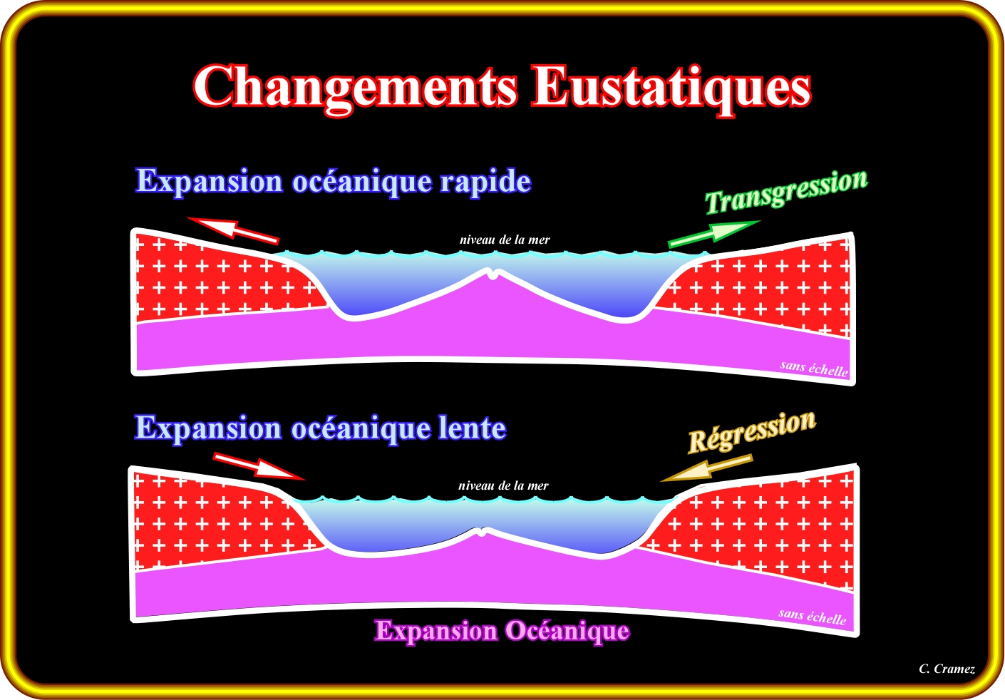 Admettant que depuis la formation de la Terre (environ 4,5 Ga), la quantité d'eau, sous toutes ses formes, est constante, et que le volume des bassins océaniques varie à travers l'histoire géologique, les changements eustatiques sont, principalement, le résultat des variations du volume des bassins océaniques. En fait, le volume des bassins océaniques est, relativement, plus grande quand les continents s'unissent pour former un supercontinent, une fois que la majorité des montagnes océaniques est consommée le long des zones de subduction de type-B. Au lieu de cela, quand les continents sont éloignés un des autres, entre eux il y a des nombreuses rides médio-océaniques (montagnes océaniques) et, par conséquent, le volume des bassins océaniques est, relativement, plus petit. Dans le premier cas, le niveau eustatique est bas et dans le second il est haut. Ainsi, comme illustré dans ces schémas, lorsque l'expansion océanique est rapide, il y a un volume des rides océanique et de ce fait le niveau de la mer monte envahissant les continents (transgression). Au contraire, lorsque l'expansion océanique est lente, le volume des rides océaniques est plus faible et le niveau de la mer descend, ce qui produit une régression. Le taux d'expansion océanique est, en moyenne, de 1 cm par an (à peu près le taux de croissance des ongles d'un être humain). Ne confondons pas ces transgressions et régressions globales, associées avec des montées et descentes eustatiques, avec les transgressions et régressions locales, comme celles d'un cycle séquence séquence. Dans ce cas, les transgressions et régressions nécessitent toujours une montée relative du niveau de la mer. La différence est que lors d'une transgression, la montée relative du niveau de la mer est en accélération, tandis que lors d'une régression, elle est en décélération.