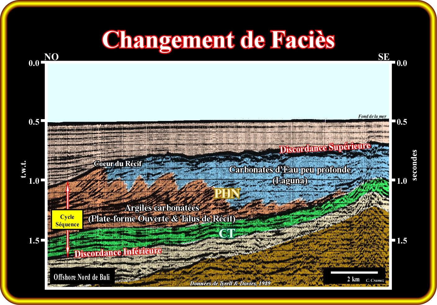 Le faciès terme a été défini par Gressly en 1835 comme une lithologie avec une faune associée. Un environnement ou milieu sédimentaire n'est pas un faciès. Le premier est une partie de la surface terrestre physique, chimique et biologiquement distincte des régions environnantes. Un faciès est une masse de rocheuse, qui peut être définie et distinguée des autres par sa lithologie, géométrie, structures sédimentaires et fossiles. De toute façon, il est toujours important de distinguer un environnement sédimentaire d'un faciès. Évidement, qu'il n'y a aucun problème en identifier un environnement sédimentaire dans les sédiments récents. Si vous allez à la plage et si vous prenez un échantillon du sable de la plage-basse, par définition, c'est un sable de la plage basse. Toutefois, lorsque l'on étudie les sédiments anciens, soit sur le terrain soit sur les données sismiques, il est préférable de commencer par les classer en faciès, sur une base lithologique purement descriptive. Par conséquent, on doit parler d'un faciès de sable grossier, faciès de fliche et non de faciès fluvial ou faciès turbiditique. On doit éviter de dire, par exemple: "Cet intervalle correspond à des sables de faciès deltaïque". Il est préférable et beaucoup plus correct de dire: «Cet intervalle correspond à un faciès sableux déposé dans un milieu deltaïque". Et, surtout, nous ne devons jamais dire "Une carte de faciès» quand sont les environnements sédimentaires qui sont cartographiées. Dans cette tentative d'interprétation d'une ligne sismique de l'offshore de l'Indonésie n'est pas difficile d'identifier un changement de faciès dans le prisme de haute niveau (PHN) du cycle-séquence incomplet limité entre les deux discordances (chute relative du niveau de la mer qui définie un cycle eustatique de 3e ordre, c'est-à-dire, avec une durée entre 0.5 et 3.5 My). Dans ce cycle-séquence se sont déposé uniquement les cortèges sédimentaires de haut niveau, autrement dit, le cortège transgressif (CT), dont la configuration interne est, plus ou moins, parallèle, mais qui, régionalement, a une géométrie rétrogradante et le prisme de haut niveau (PHN) dont la configuration interne est progradante. C'est le long des progradations qu'on note un changement de faciès. Les carbonates de l'eau peu profonde, en amont (SO), passent, en aval, à des argiles carbonatées.