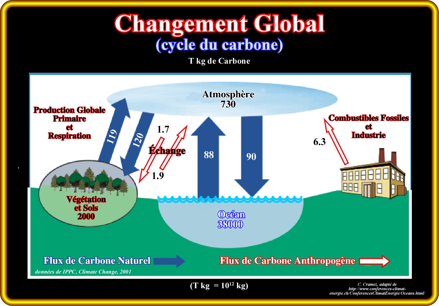 Un des changements globaux qui est à la mode est celui du CO_2. Les concentrations de CO_2 dans l'atmosphère sont régulées par de nombreux processus qui forment le cycle du carbone. Le mouvement (flux) du carbone entre l'atmosphère, terre et océans est dominé par des processus naturels comme la photosynthèse. Bien que ces processus puissent absorber une partie des 6.1 x 10^9 t (tonnes) des émissions anthropiques de CO_2 produites chaque année, environ 3.2 x 10^9 t sont ajoutés chaque année dans l'atmosphère. Le déséquilibre entre les émissions et absorption résulte dans une augmentation continue de la quantité de gaz à effet de serre dans l'atmosphère. Cependant, étant donné la variabilité naturelle du climat de la Terre, il est difficile de déterminer l'importance du changement que les humains causent. Dans les modèles sur ordinateur, l'augmentation des concentrations de gaz à effet de serre provoque une augmentation de température et changements climatiques. Certains géoscientistes suggèrent même que le climat s'est réchauffé au cours du siècle dernier et que l'activité humaine humain est le facteur le plus important. Cependant, comparons les numéros suivants : (i) L'atmosphère contient ± 750 GtC ; (ii) La surface des océans contient ± 1000 GtC ; (iii) La végétation, sols et déchets contient ± 2200 GtC ; (iv) Les océans contiennent ± 38 000 GtC, ce qui donne un total ± 42 000 GtC. D'autre part, chaque année : (a) La surface des océans échange avec l'atmosphère ± 90 GtC ; (b) La végétation échange avec l'atmosphère ± 60 GTC ; (c) Le plancton échange avec les eaux profondes ± 50 GtC ; (iv) L'eau de surface échange d'avec l'eau profondeur ± 100 GtC, ce qui donne un total de ± 300GtC par an. En outre, chaque année sont injectées dans l'atmosphère : (1) Par l'homme, ± 3GtC ; (2) Par les combustibles, ± 5 - 7 GtC ; (3) Par le terrain, ± 2 GtC ; (4) Par la respiration, ± 0.3 GtC ; (5) Par les animaux domestiques, ± 0.75 GtC ; (6) Par les déchets, ± 0.5 GtC, soit un total de ± 13 GtC. Ainsi, pour une croissance économique de 3% par an, seront introduits dans l'atmosphère ± 0.09 GTC par an, ce qui signifie pratiquement rien. Par conséquent, pour le bien de l'humanité est mieux continuer à croître pour avoir moins de pauvres et moins de chômage, comme certains, mais pas tous, les écologistes le suggèrent.